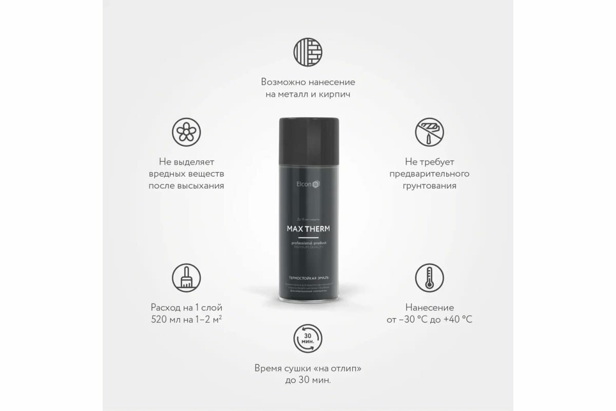 Термостойкая краска Elcon Max Therm для металла, печей, мангалов, радиаторов, дымоходов, суппортов графит до 700 градусов, матовая, аэрозоль 520 мл