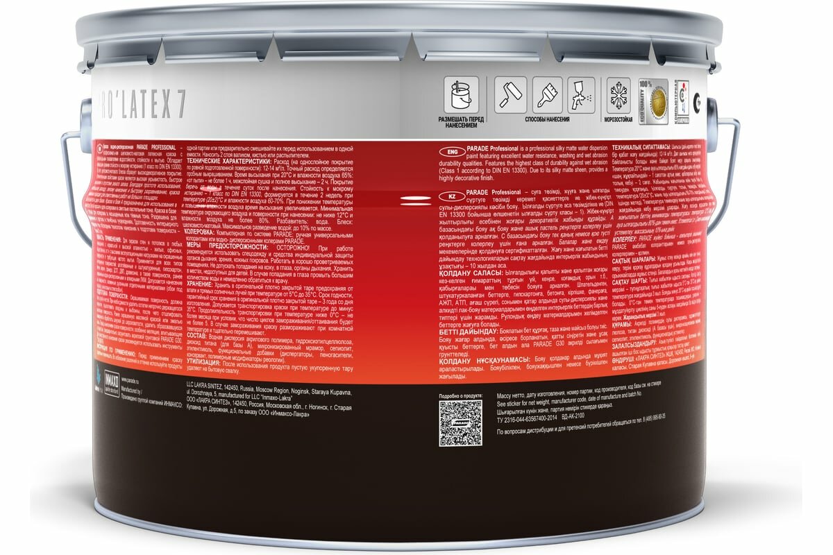 Краска латексная Parade Pro'latex Е7 база А шелковисто-матовая 9 л Россия Лк-00003411 .