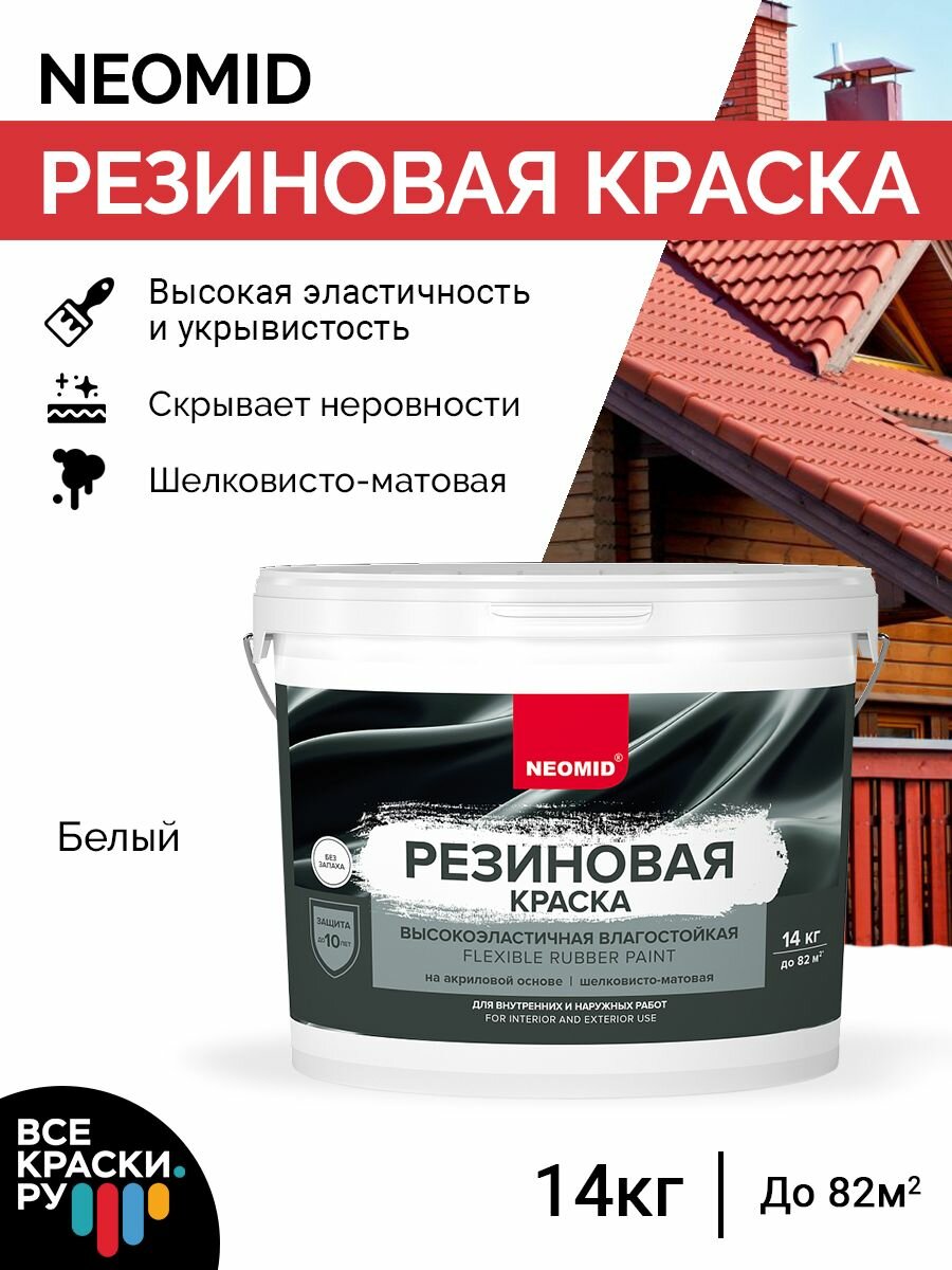 Краска Резиновая Neomid 14кг Белый для Кровли, Цоколя, Фасада Суперэластичная, Универсальная / Неомид Резиновая.