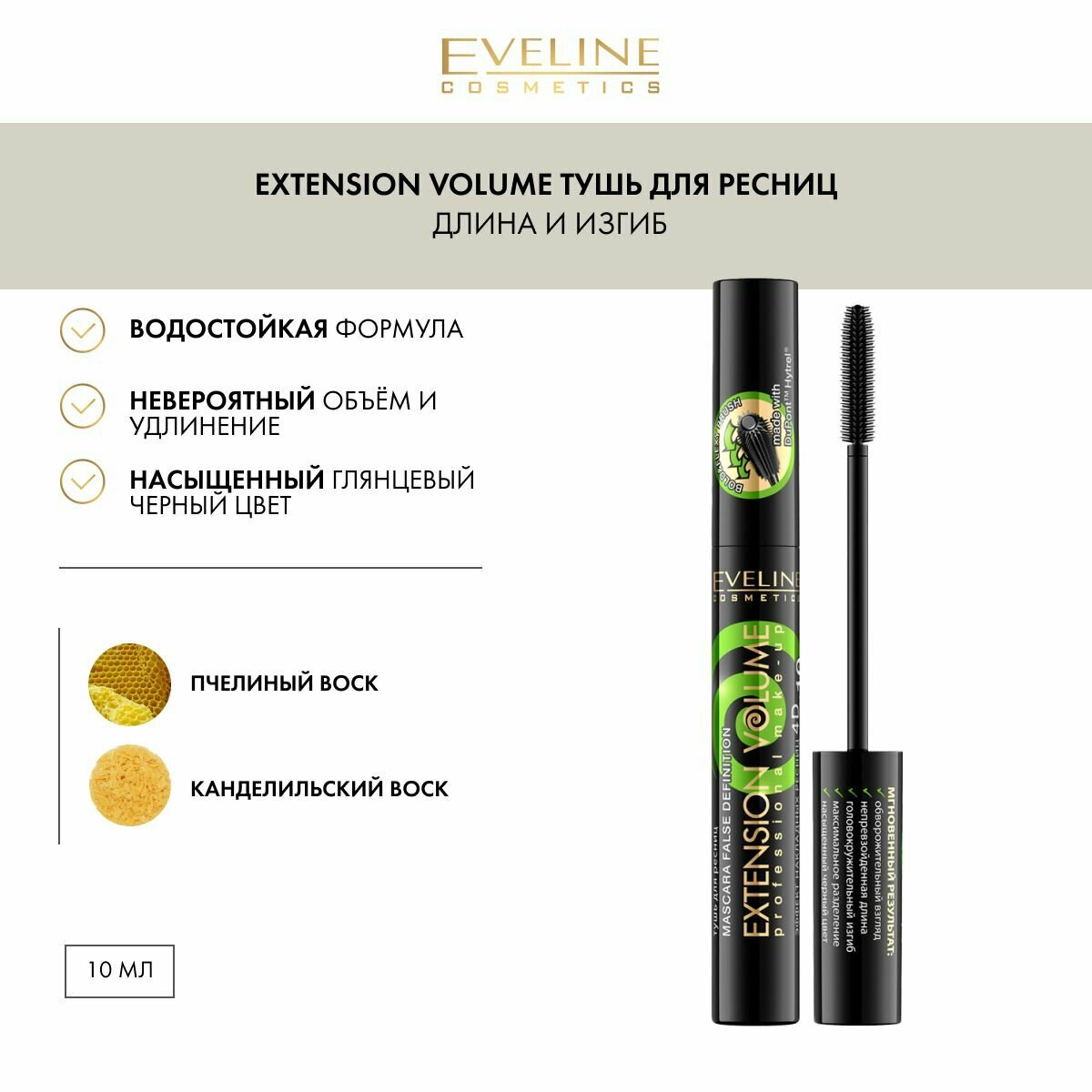 Тушь для ресниц Eveline Extension Volume экстремальная длина и изгиб х10 черная, 10мл