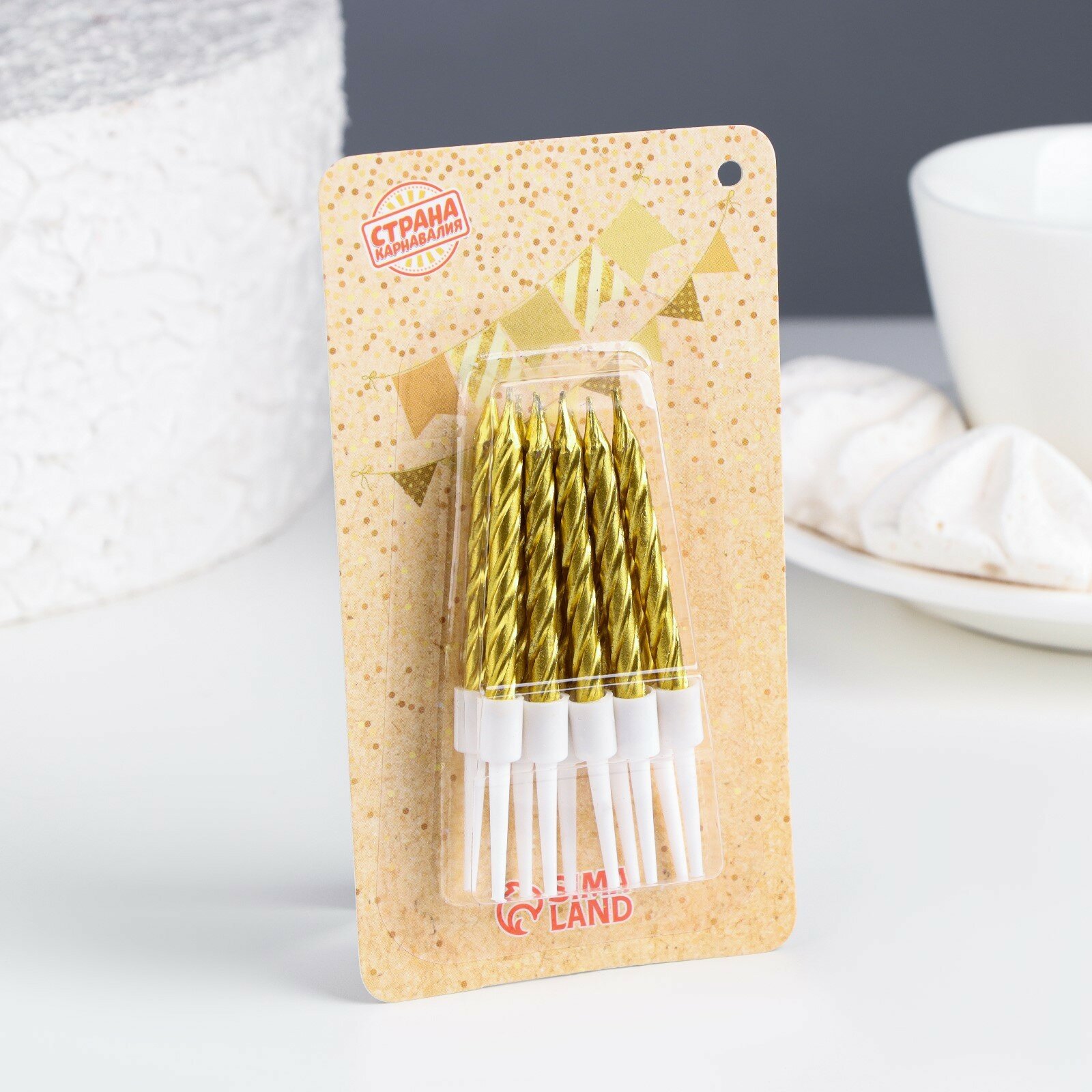 Свечи в торт "Спираль", 10 шт, средние, 7 см, золотой металлик, Страна Карнавалия