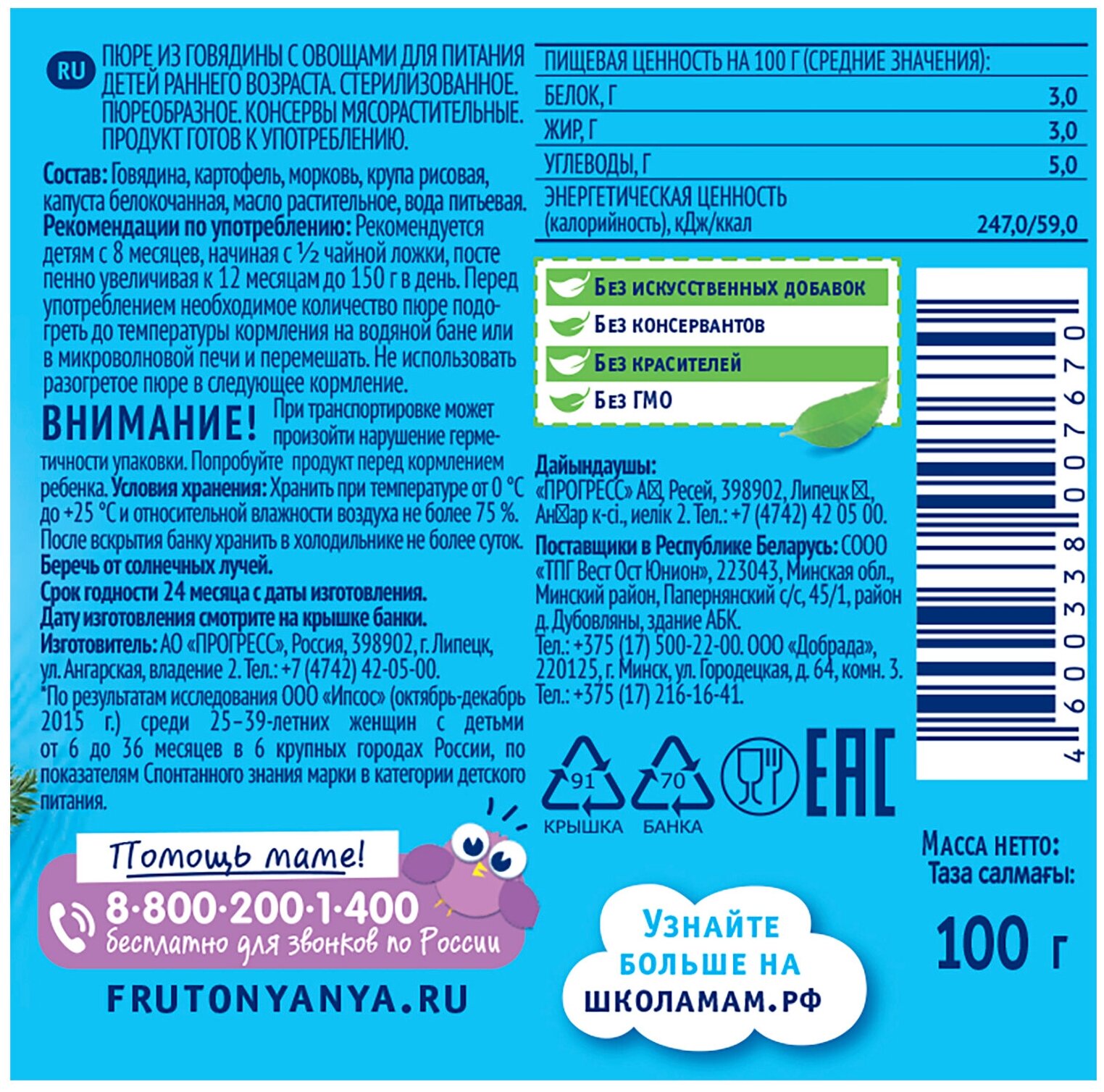 ФрутоНяня Пюре из Говядины с Овощами (Картофель, Капуста, Морковь) {с 8 мес} ст/б 100г.