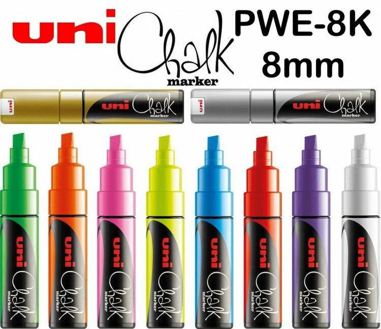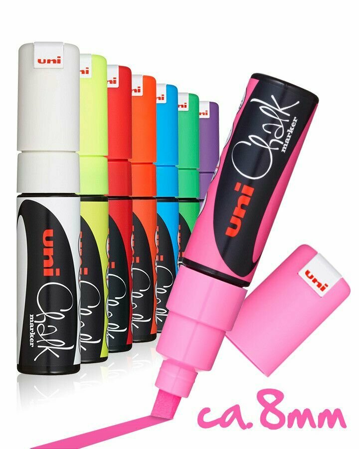 Меловой маркер - жидкий мел Uni Chalk PWE-8K скошенный наконечник 8 мм Флуоресцентно-розовый,