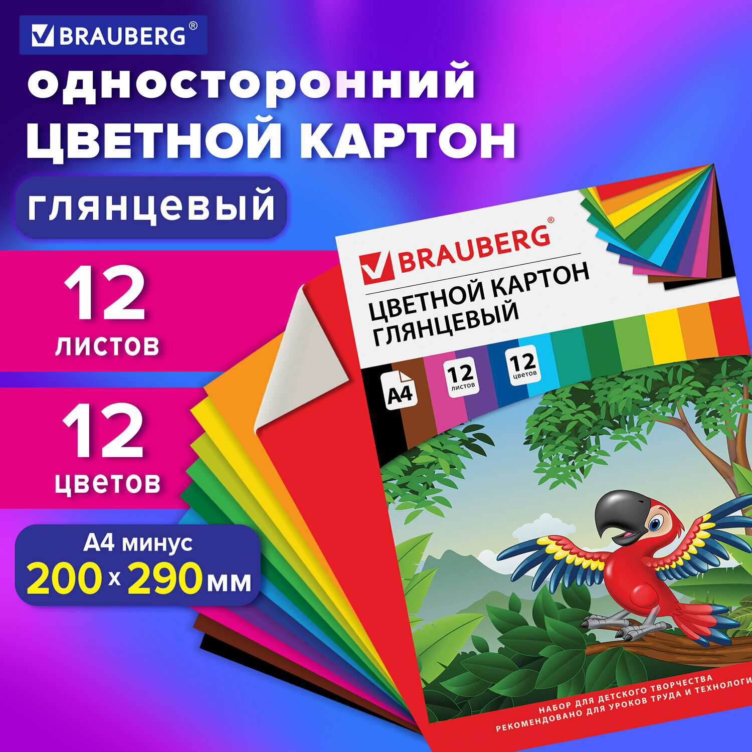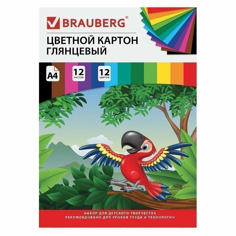 Цветной картон Килиманджаро BRAUBERG, A4, 12 л., 12 цв. 1 наборов в уп. 12 л.