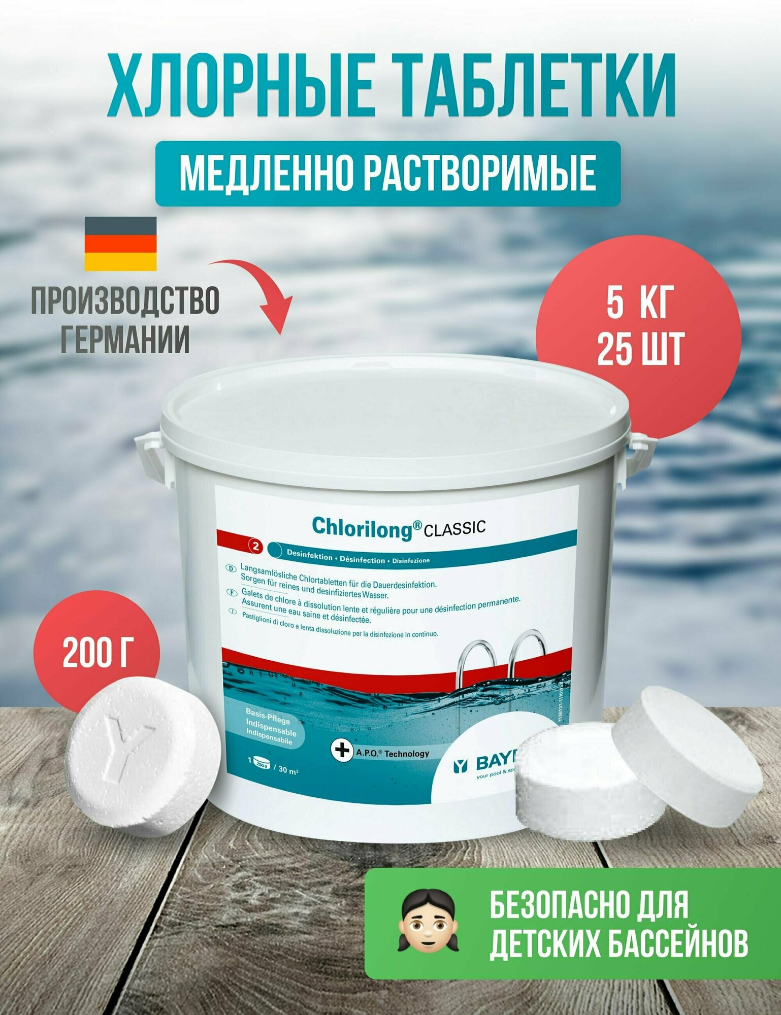 Медленно растворимые таблетки 200 гр Bayrol Хлорилонг, 25 кг, цена за 1 шт