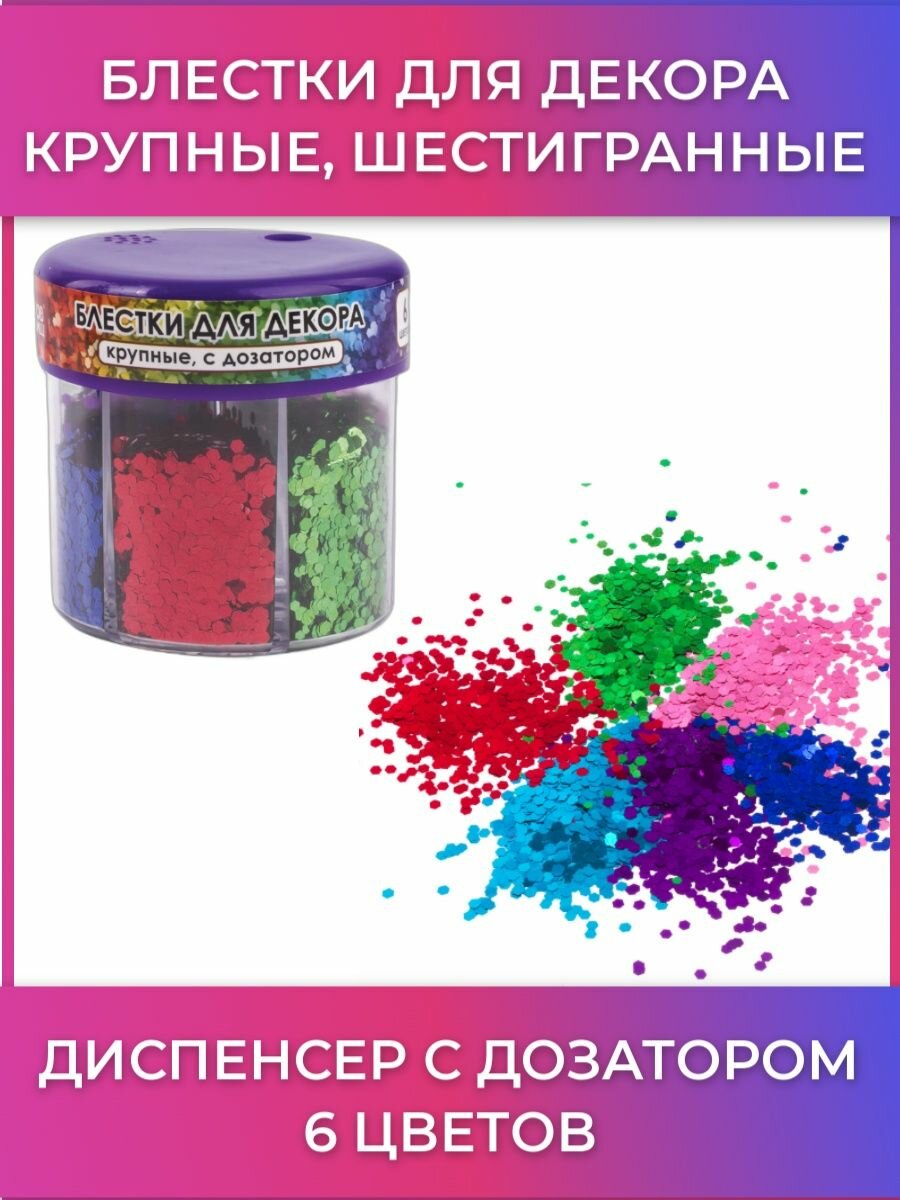 Блестки для декора остров сокровищ, крупные шестигранные, в диспенсере с дозатором, 6 цветов по 9 грамм, 662227