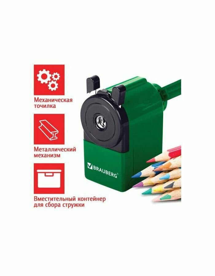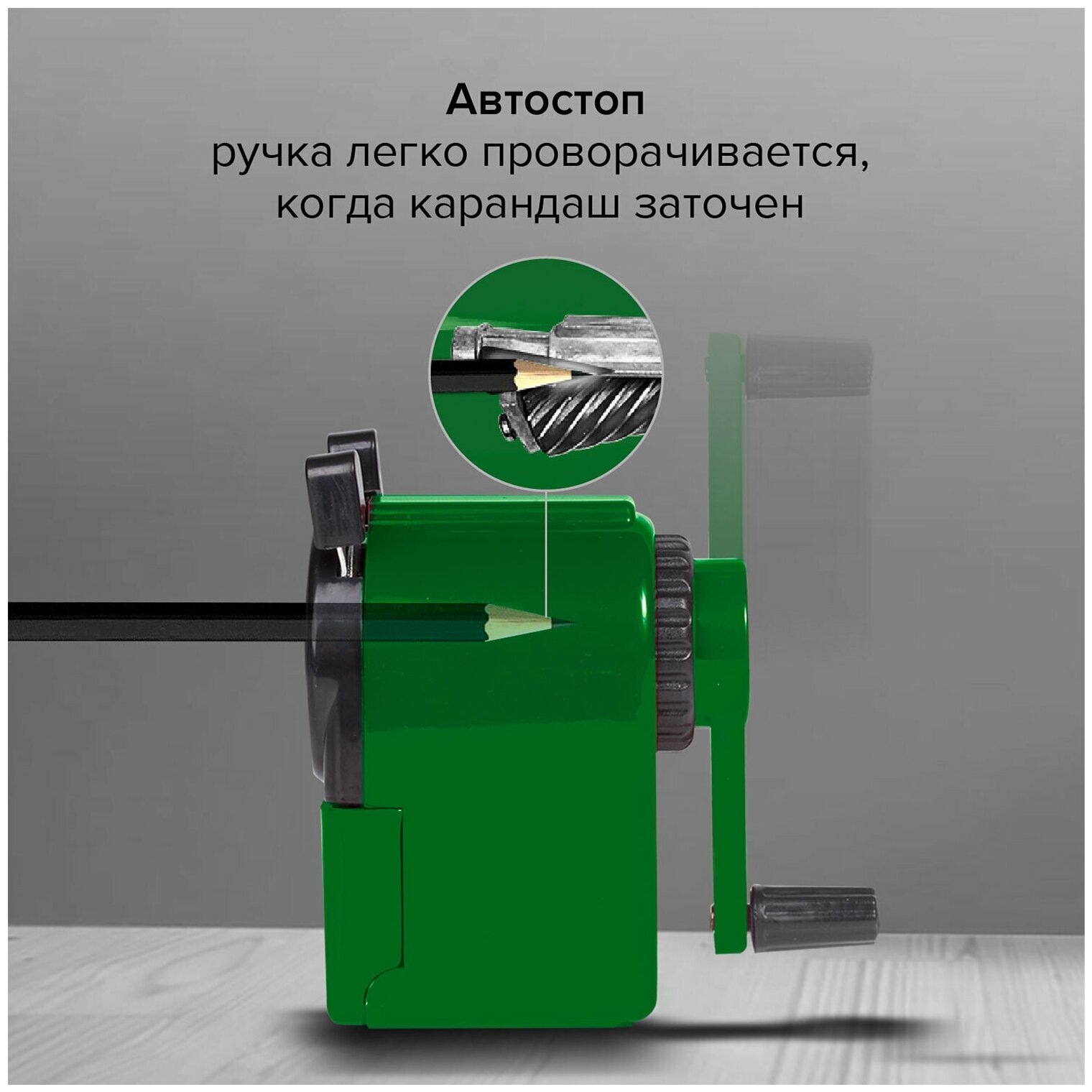 Точилка механическая настольная для карандашей с контейнером для стружки Brauberg Jet, металлический механизм, корпус зеленый, 229571