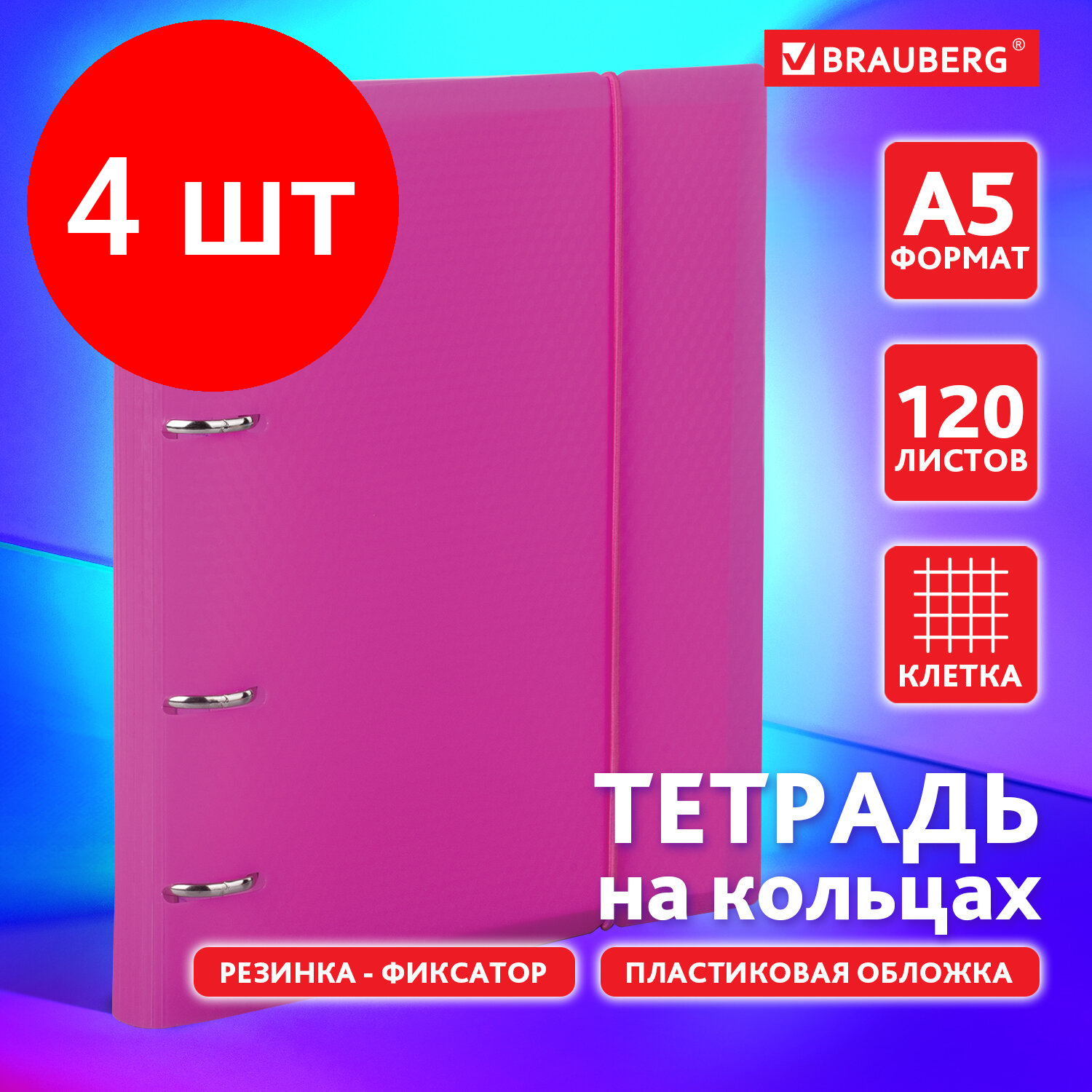Тетрадь на кольцах А5 175х220 мм, 120 л., пластик, клетка, с резинкой, BRAUBERG, розовая, 403572 упаковка 5 шт.