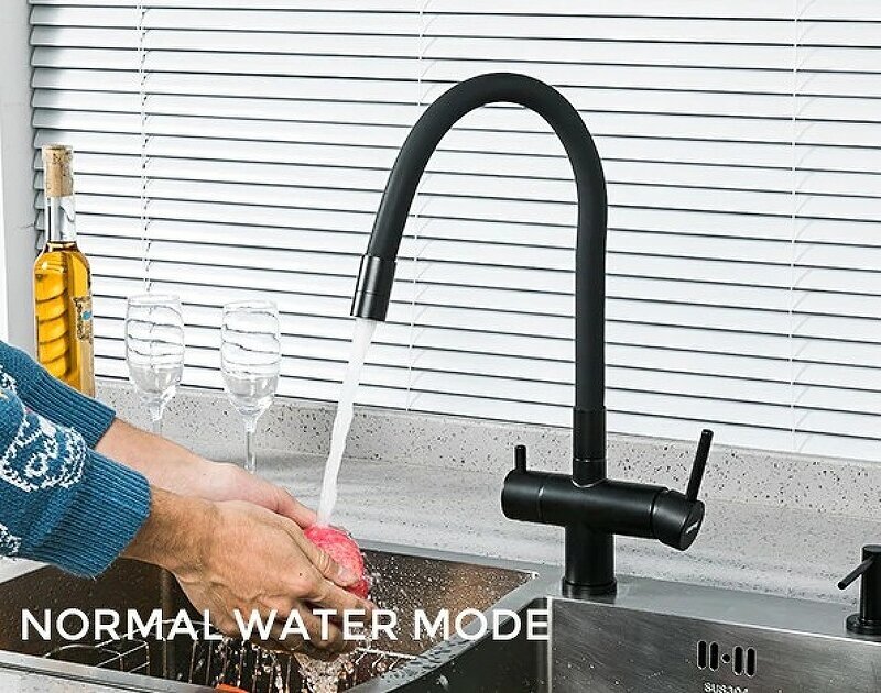 Смеситель для кухни с гибким изливом и подключением фильтра питьевой воды, черный матовый