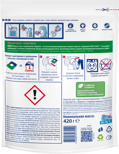 | Способ применения | 1 капсула для 4-5 кг белья и воды любой жесткости. 3 капсулы для сильных загрязнений, жесткой воды, > 7 кг белья. Положите капсулу в барабан стиральной машины, загрузите белье, начните стиркку. |