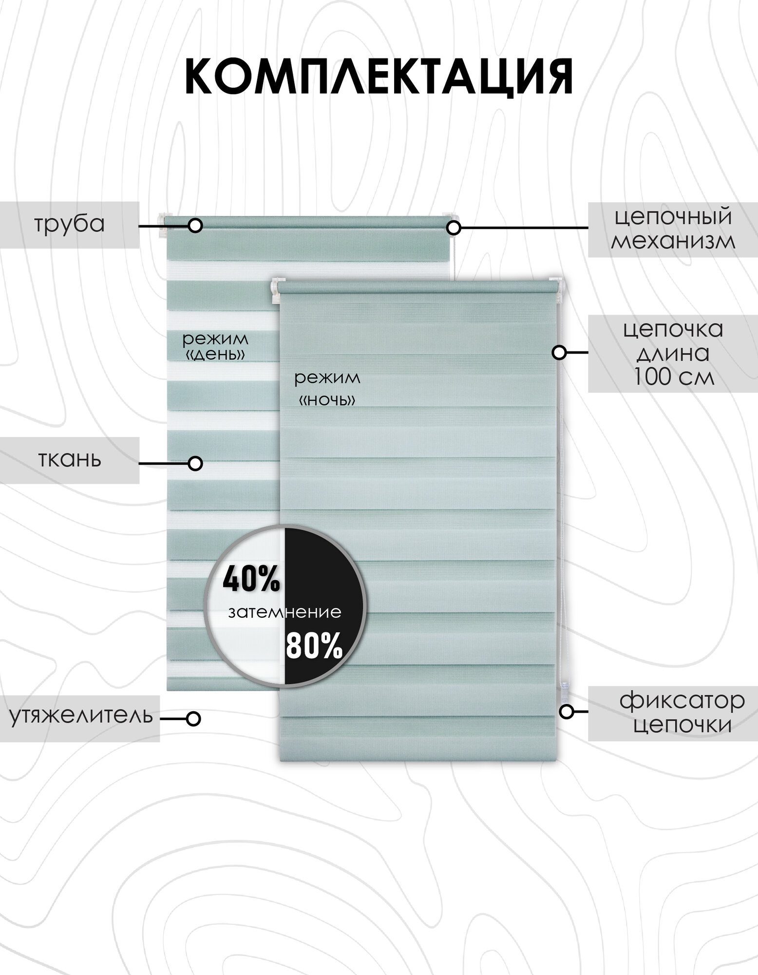 | Комплектация | штора "День-ночь" с трубой, ограничитель, цепочный механизм с заглушкой, заглушка-фиксатор, фиксирующая профильная планка, держатели, площадка с двусторонним скотчем, утяжелитель, навесной кронштейн, зажим, шурупы, фиксатор для цепочки |