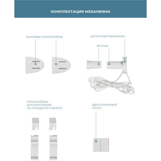 | Комплектация | рулонная штора в сборе, механизм в сборе (D17мм), пластиковая цепочка управления, крепление на откидную створку окна без сверления, инструкция по установке |