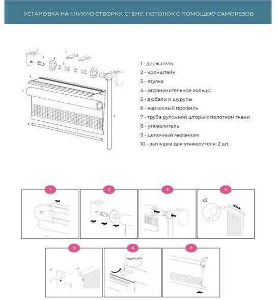| Комплектация | рулонная штора мини в сборе, цепочный механизм, комплект кронштейнов для откидной створки без сверления, утяжелитель для ткани с фиксирующими заглушками, инструкция по монтажу |