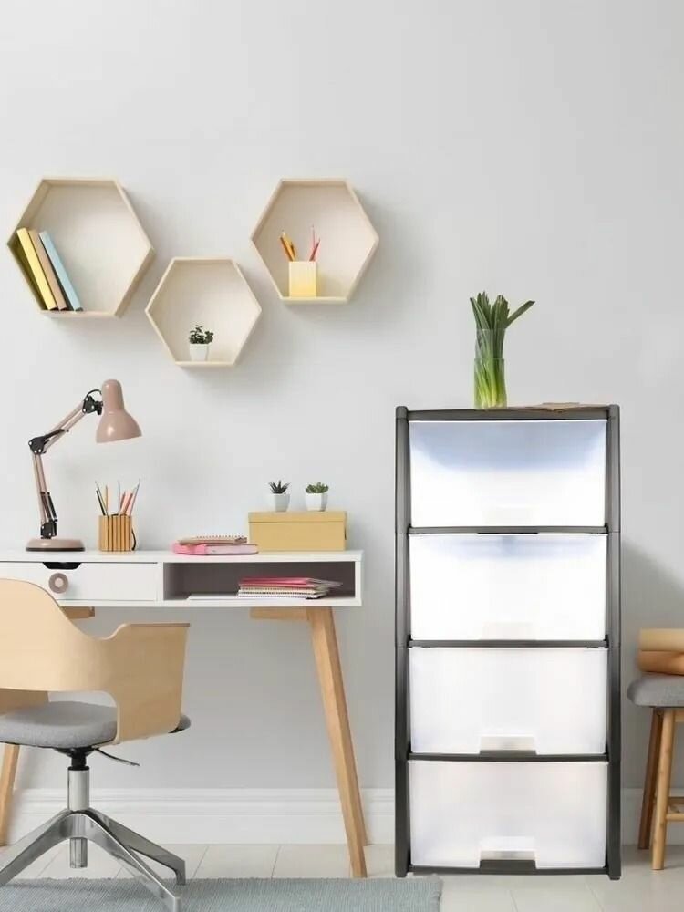 | Минусы: | Пластиковый материал не особо надежен, тяжелые предметы сложно хранить, иногда при выдвигании ящик может не полностью "выскакивать". |