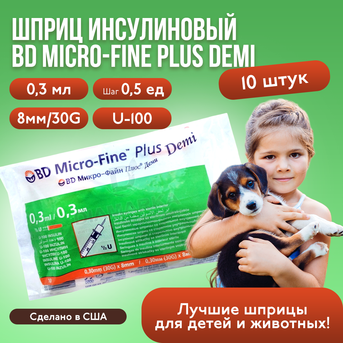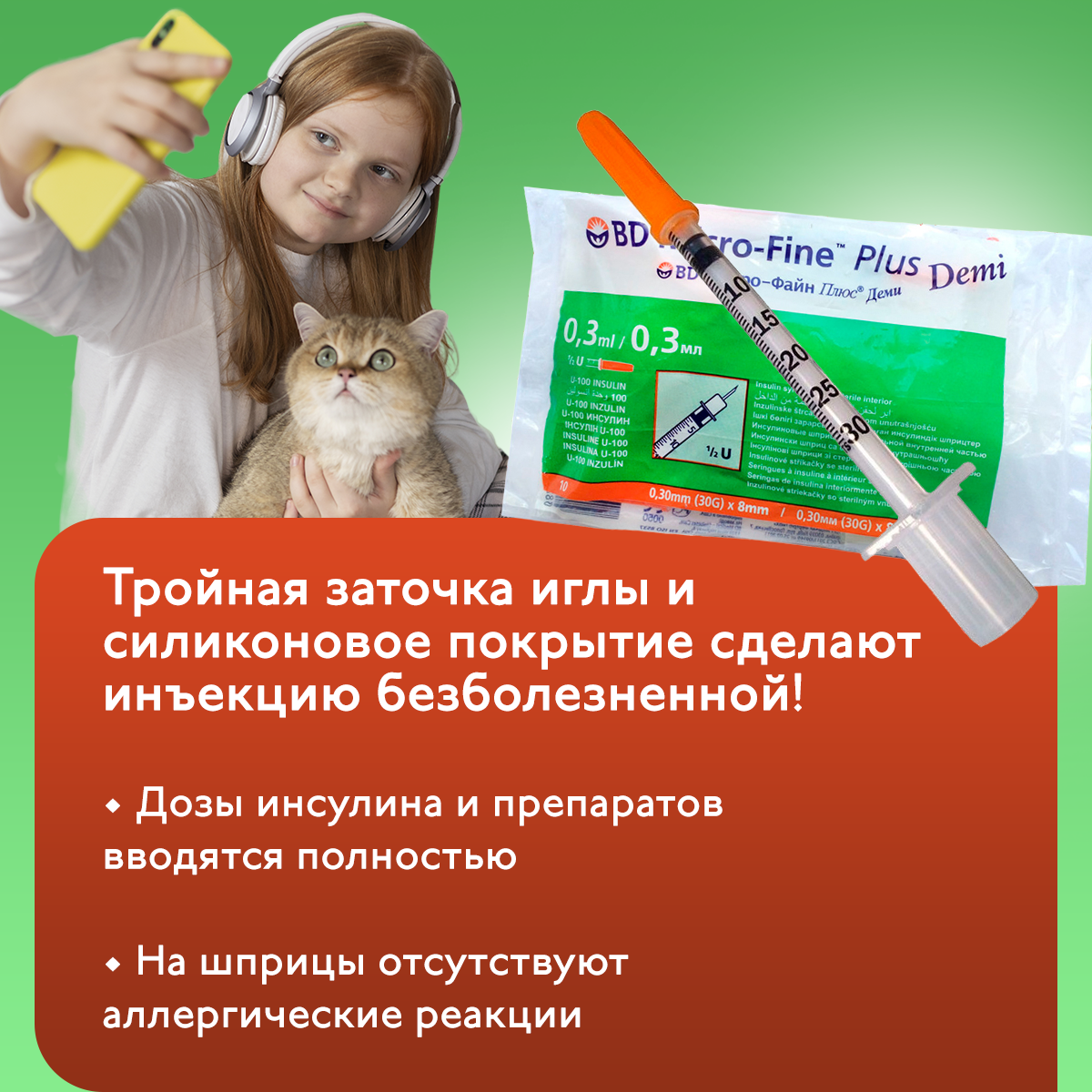 Шприц инсулиновый BD Micro-Fine Plus Demi 0,3 мл U-100 30G (0,3 мм x 8 мм) - 100 шт, для детей
