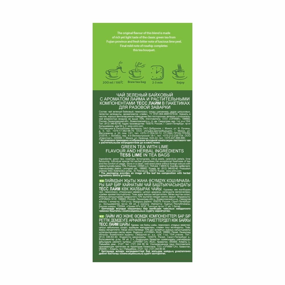 | Состав | чай зеленый байховый, лимонное сорго, плоды шиповника, цедра лимона, лепестки календулы, ароматизатор лайм |