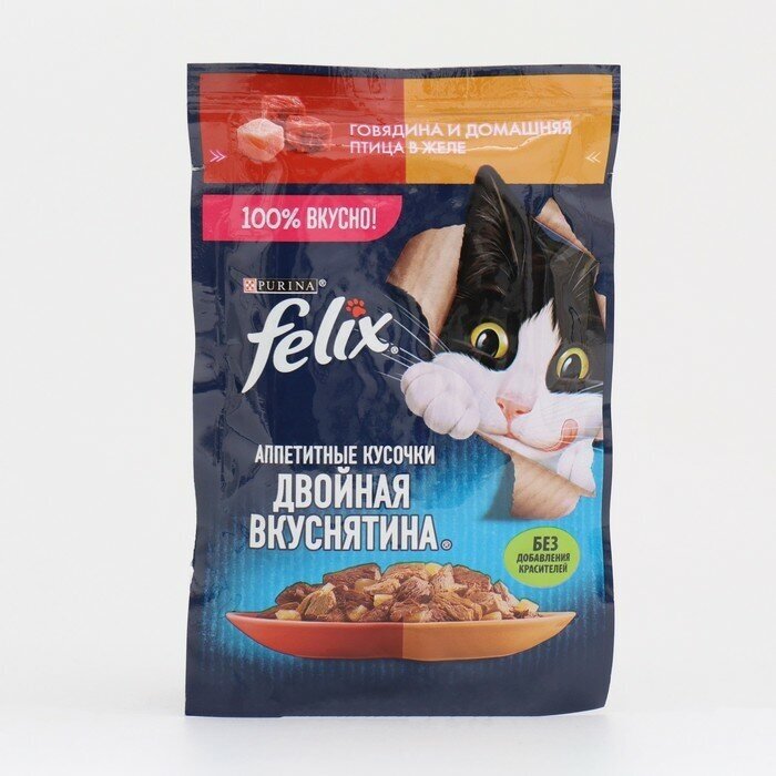 Влажный корм FELIX Аппетитные кусочки для кошек, говядина и домашняя птица в желе, пауч 75 г