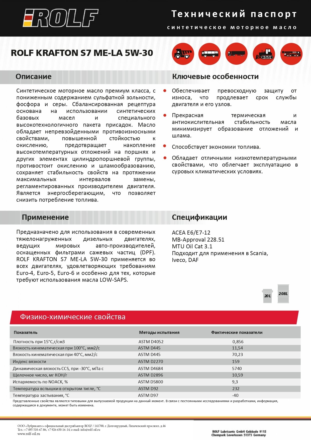Rolf krafton S7 ME-LA 5W30 ACEA E6/Е7-12 (208 л)
