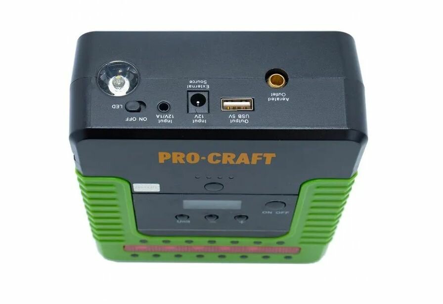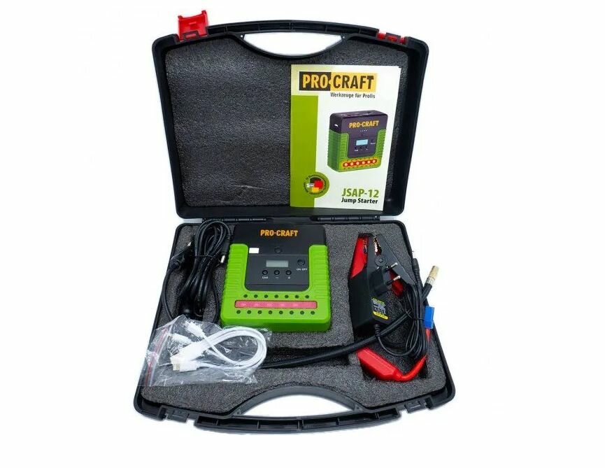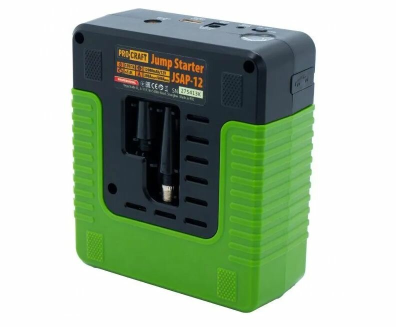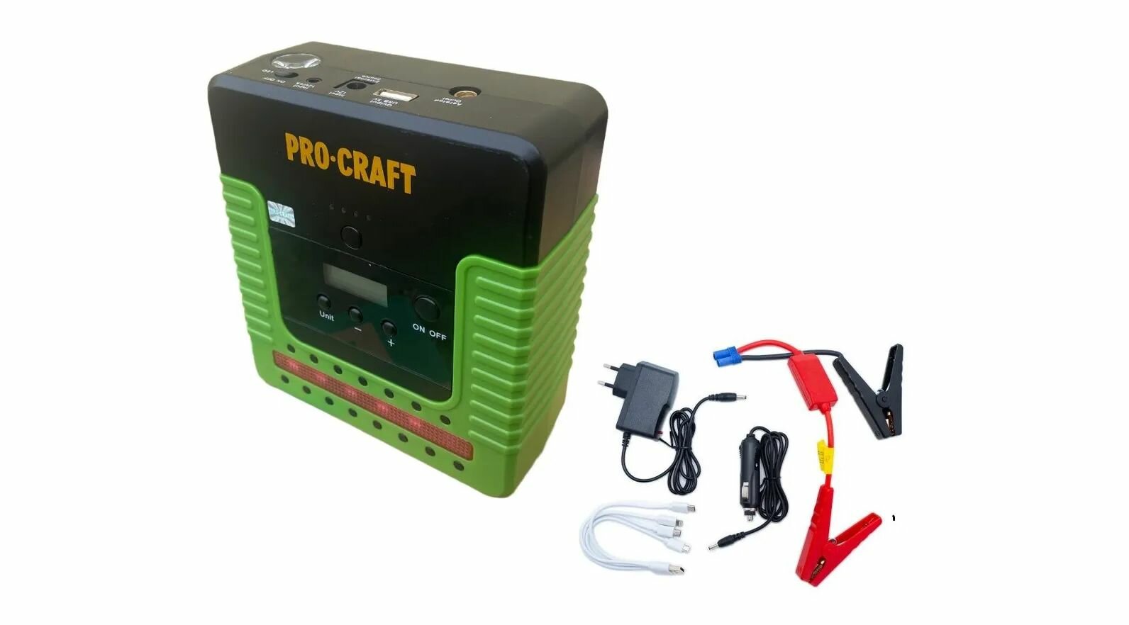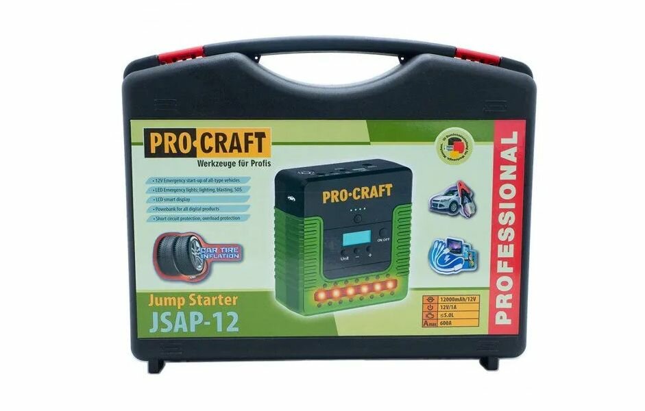 Пуско-зарядное устройство с компрессором ProCraft JSAP-12, 12000 мАч, пиковый ток 600А, Макс. объем двигателя 5л, рабочее давление 2,75 атм интересное: