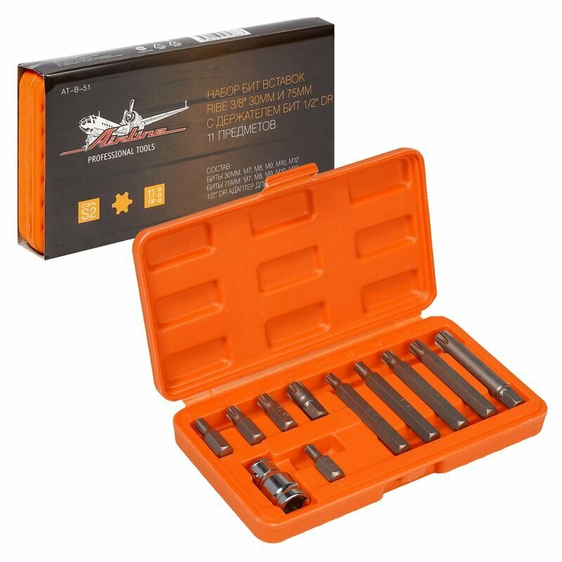 AT-B-50 AIRLINE Набор бит вставок SPLINE 3/8 30мм и 75мм с держателем бит 1/2 DR 11 предметов в кейсе (AT-B-50)