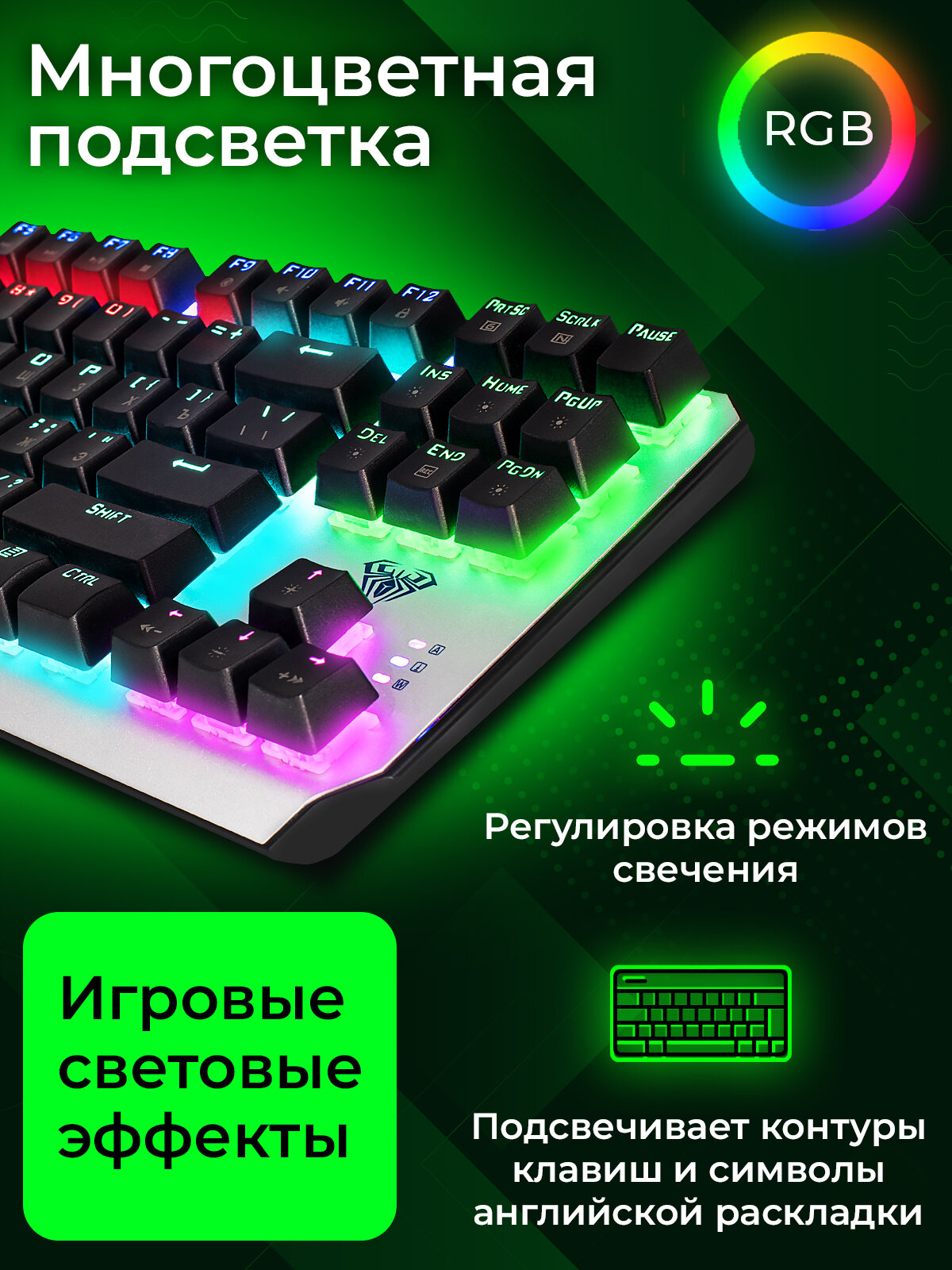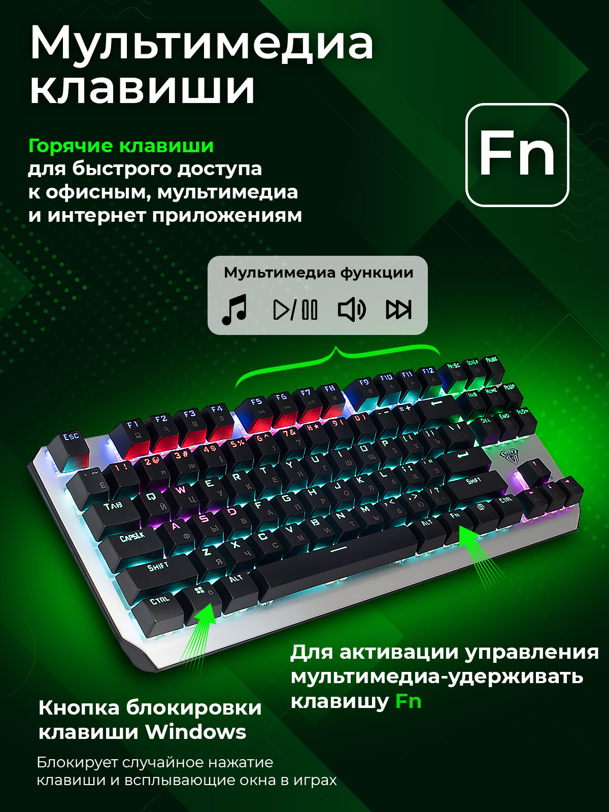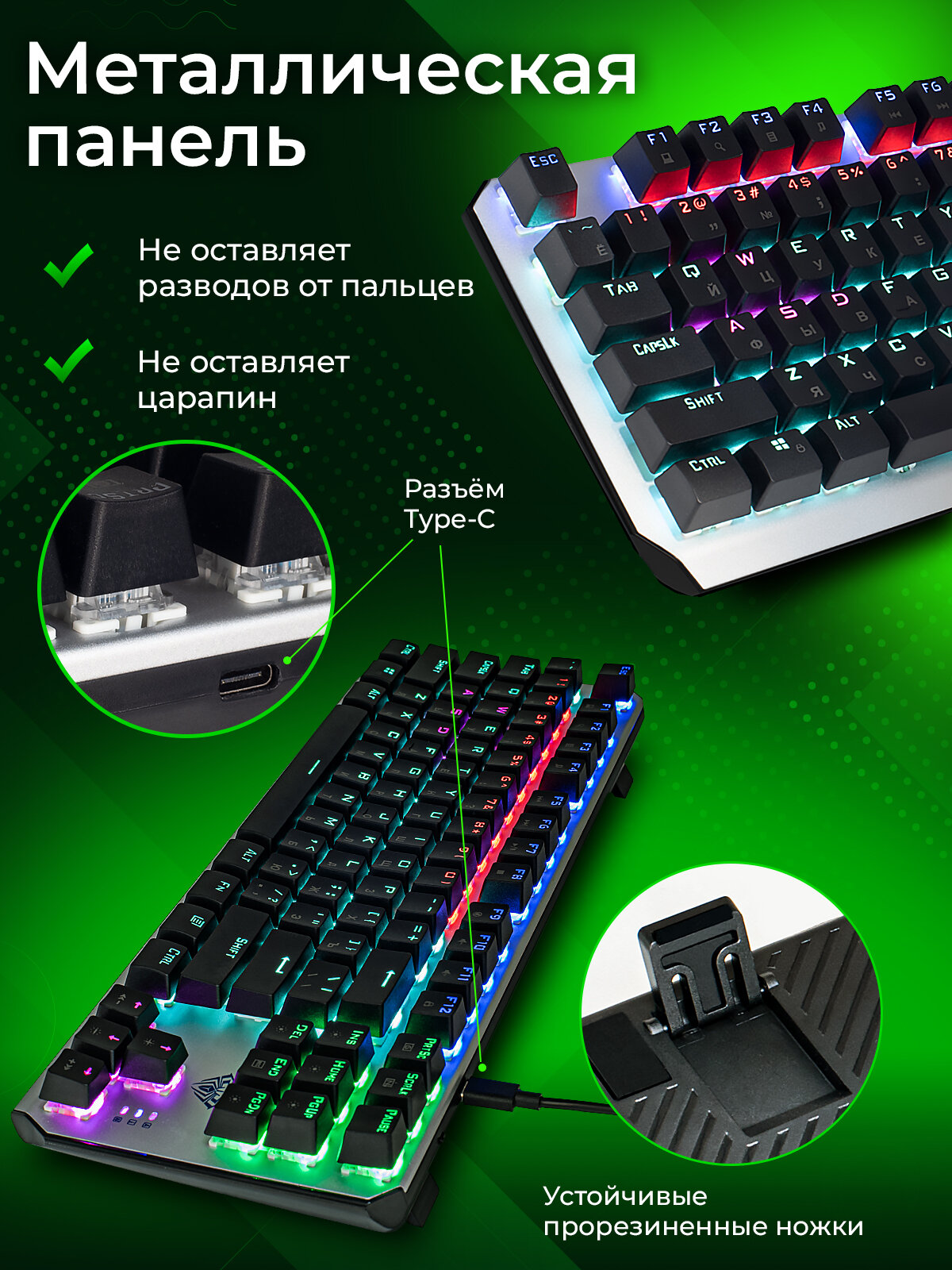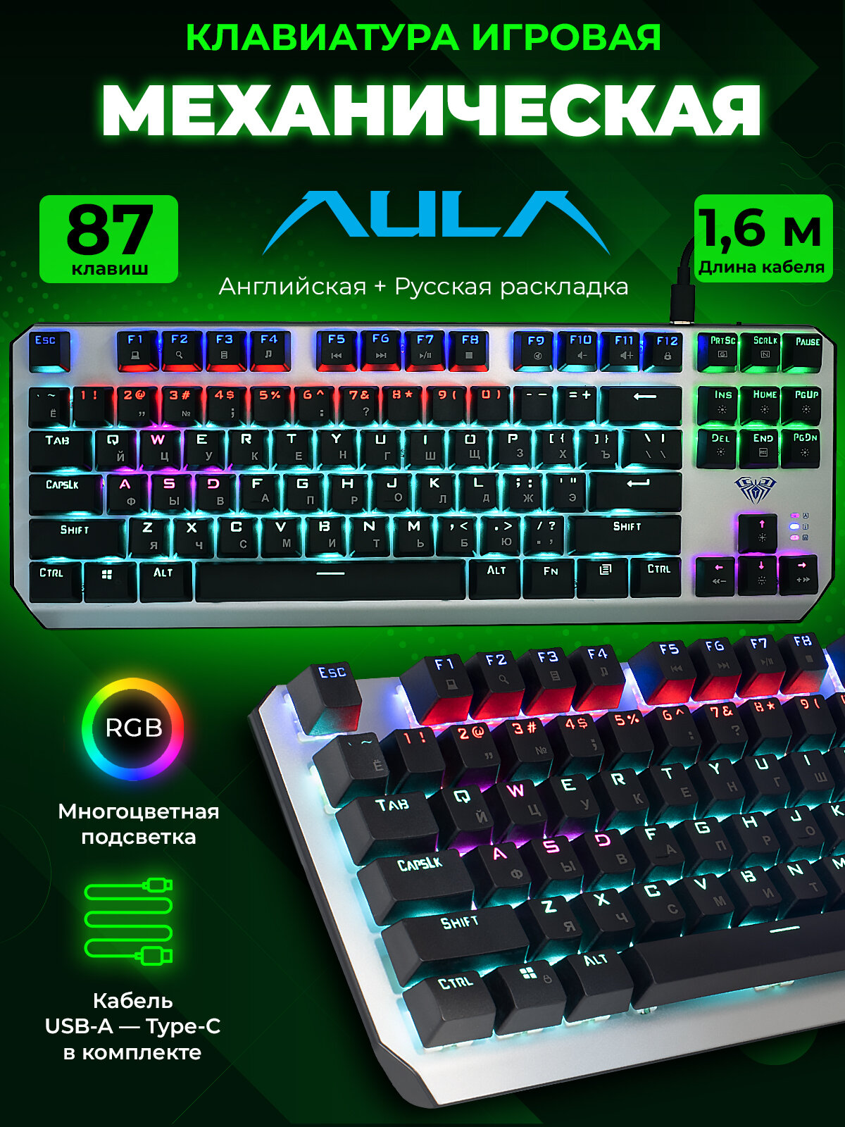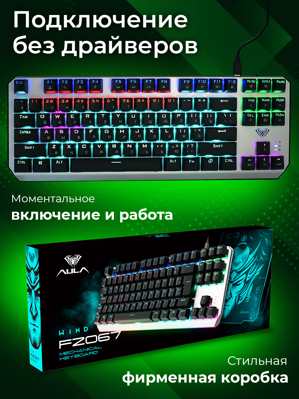 СохранитьКлавиатура механическая AULA F2067, укороченная, алюм./пластик, разноцветная, радужная подсветка, кабель 1,6м, USB, 87 кн интересное: