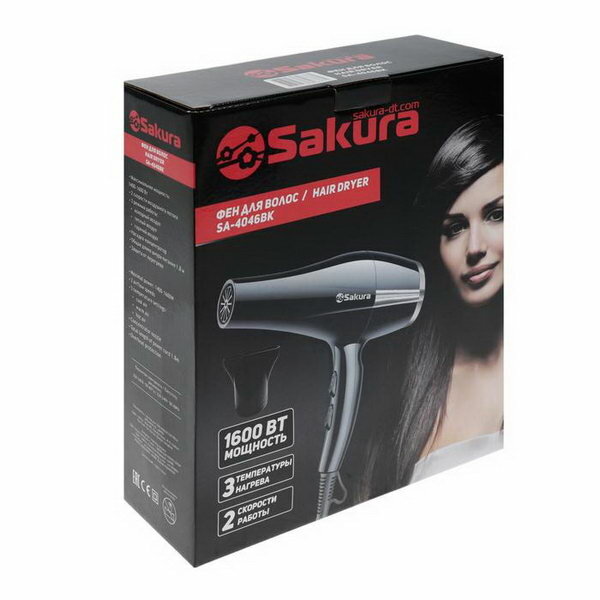 Фен Sakura SA-4046BK, 1600 Вт, 3 температурных режима, 2 скорости, серебристо-чёрный SAKURA 7009971 .