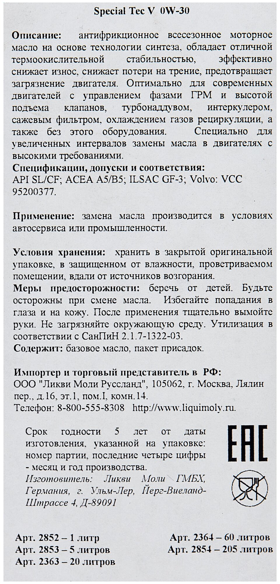 LIQUI MOLY 2852 Масло моторное синт Special Tec V 0W-30 SL A5/B5 GF-3 (1л) 2852 1шт