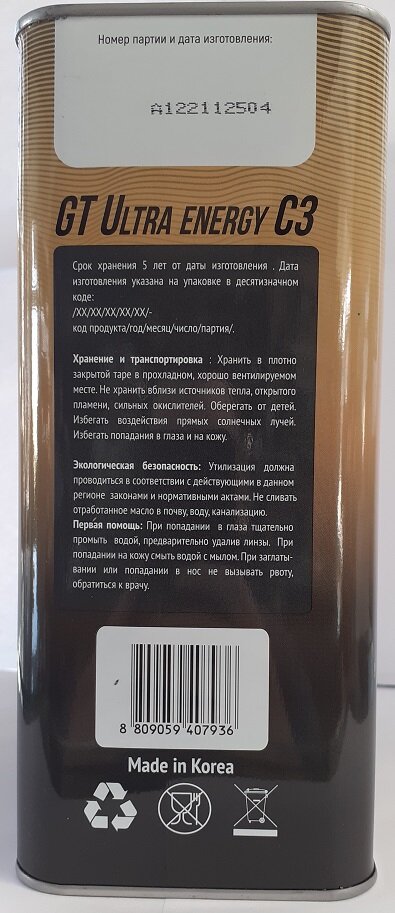 GT OIL 8809059407943 Масо моторное синтетическое всесезонное GT Ultra Energy C3, SAE 5W-30, API SM,SN/CF, 20