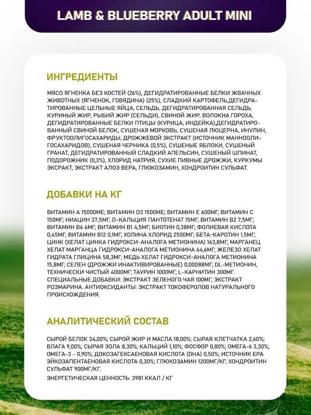 | Состав | свежее мясо ягненка без костей (26%), дегидратированное мясо ягненка (25%), картофель, дегидратированные цельные яйца, свежая сельдь, дегидратированная сельдь, животный жир, рыбий жир, волокна гороха, сушеная морковь, сушеная люцерна, инулин, фруктоолигосахариды, маннанолигосахариды, порошок черники (0,5%), дегидратированные яблоки, порошок граната, дегидратированный сладкий апельсин, порошок шпината, подорожник (0,3%), порошок черной смородины, хлорид натрия, дрожжи сухие пивные, корень куркумы (0,2%), глюкозамин, хондроитин сульфат, экстракт календулы (источник лютеина) |