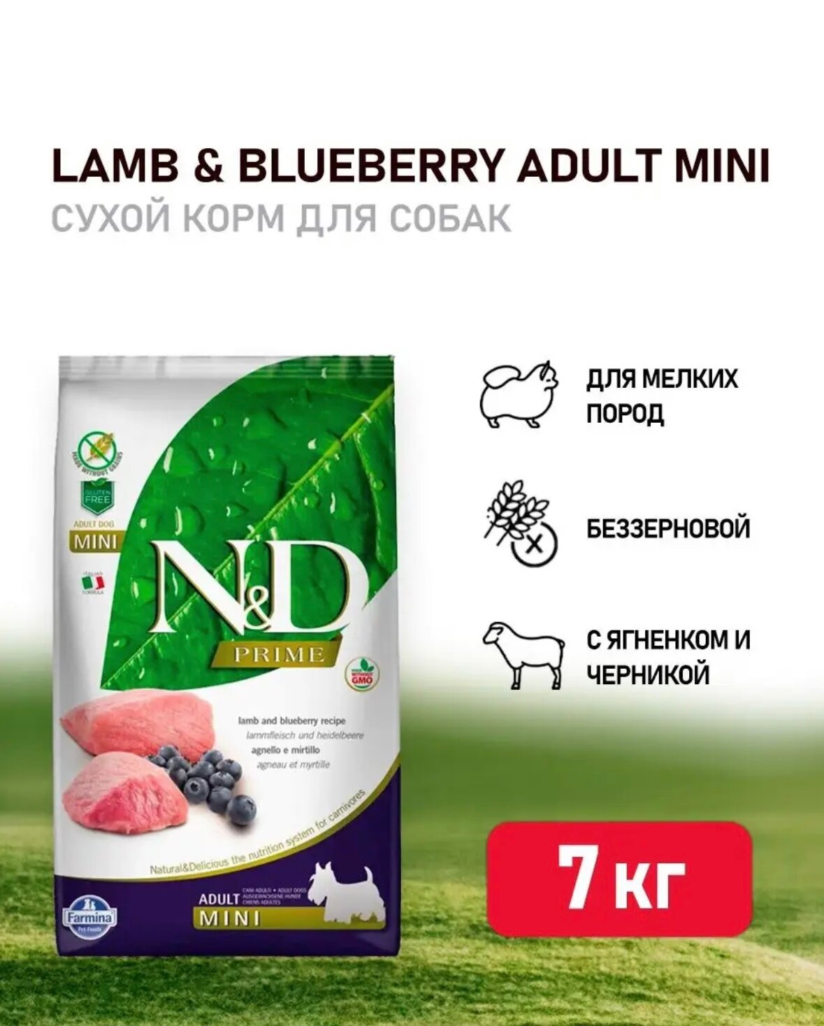FARMINA DOG N&D PRIME ADULT MINI LAMB & BLUEBERRY беззерновой для взрослых собак маленьких пород с ягненком и черникой (7 кг)