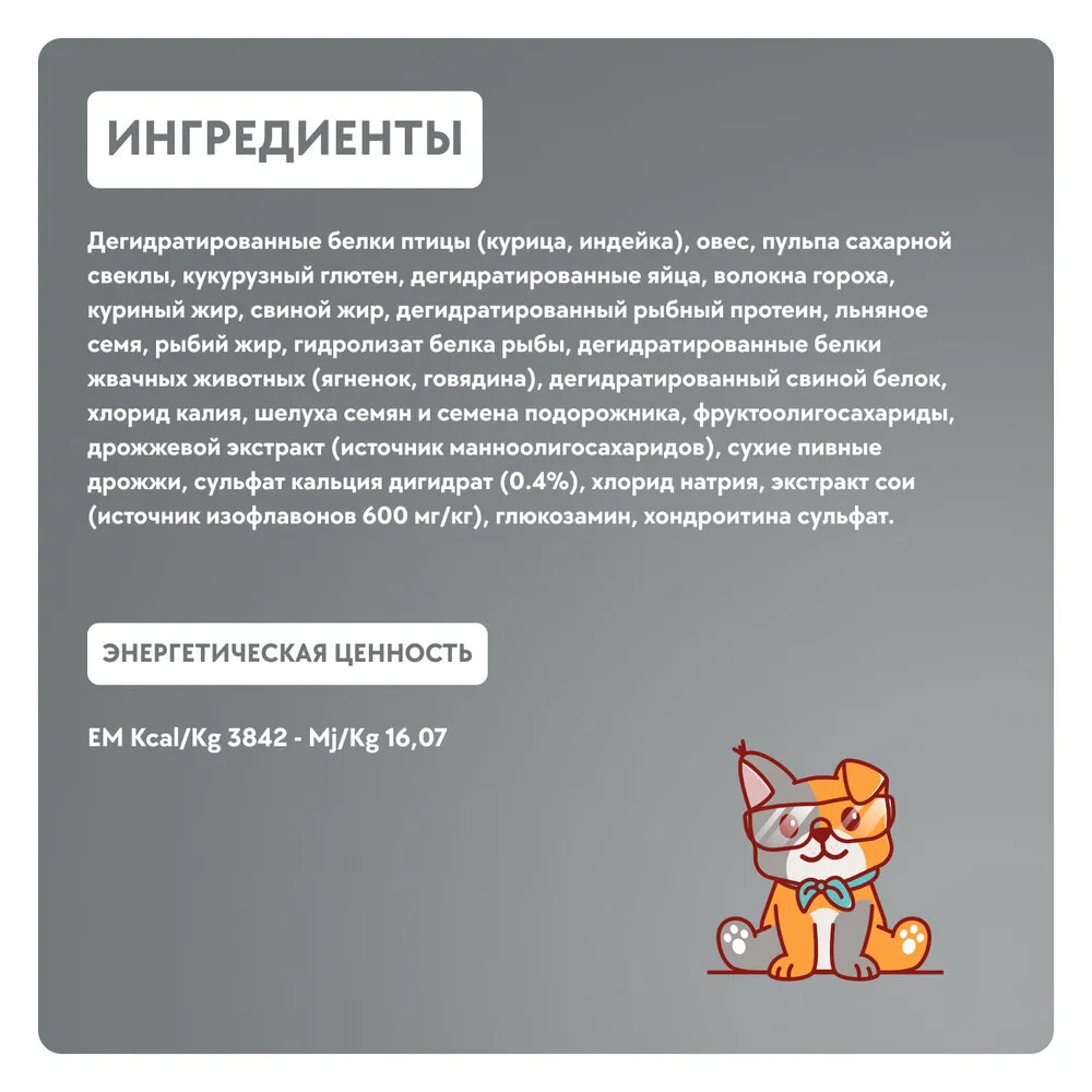 | Состав | дегидратированное куриное мясо, овес, пульпа сахарной свеклы, кукурузный глютен, дегидратированные цельные яйца, волокна гороха, куриный жир, дегидратированная рыба, льняное семя, рыбий жир, гидролизат животных белков, калия хлорид, растительное масло, подорожник, фруктоолигосахариды, маннанолигосахариды, сухие пивные дрожжи, сульфат кальция дигидрат (0,4%), хлорид натрия, экстракт сои (источник изофлавонов 600мг/кг), глюкозамин, хондроитин сульфат, экстракт календулы (источник лютеина) |
