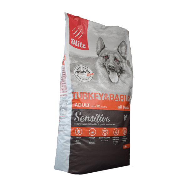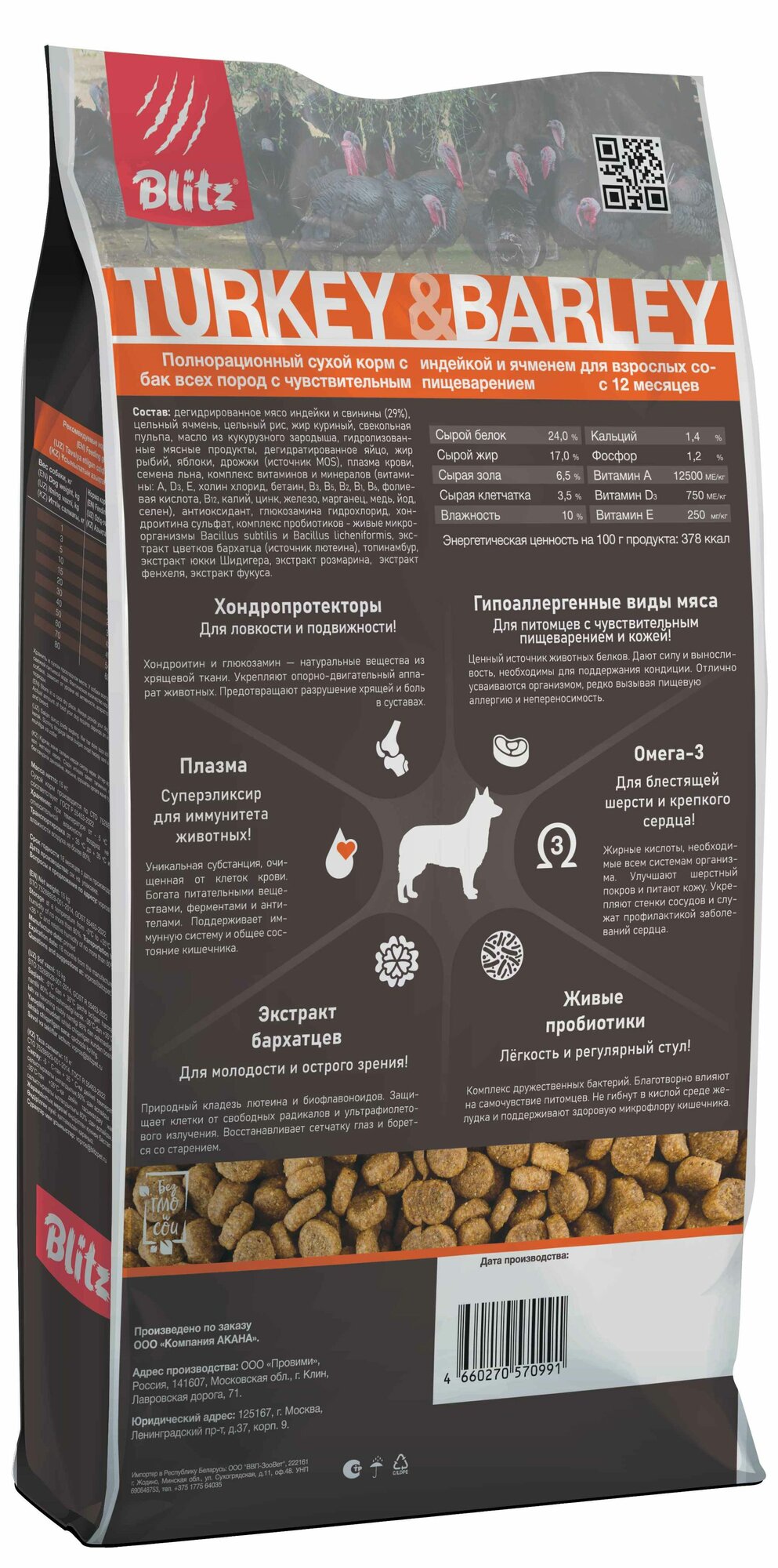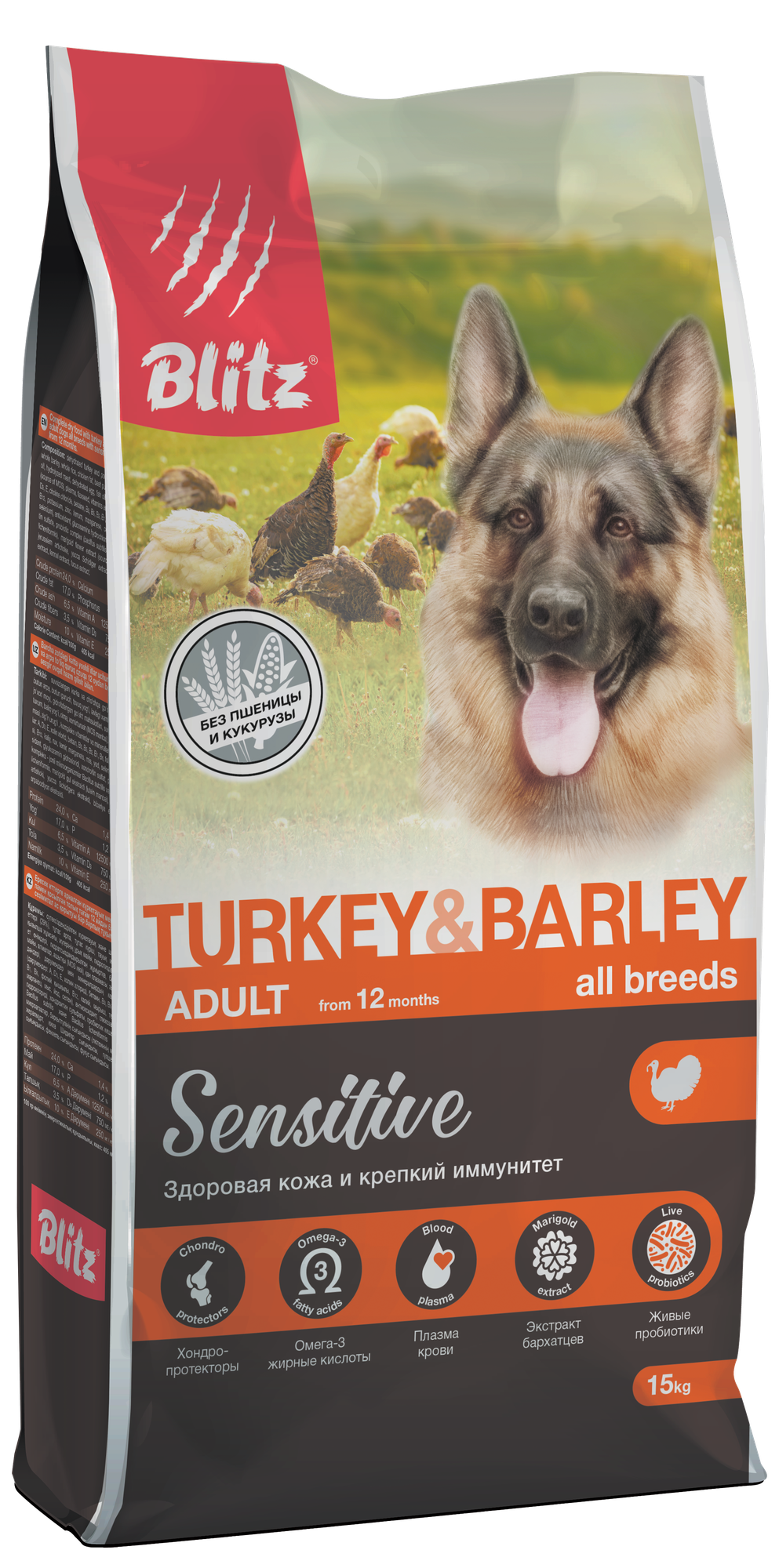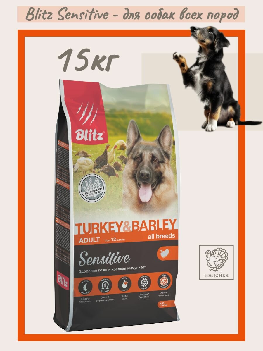 Blitz Sensitive Turkey & Barley Adult Dog All Breeds для взрослых собак всех пород с индейкой и ячменем 15 кг