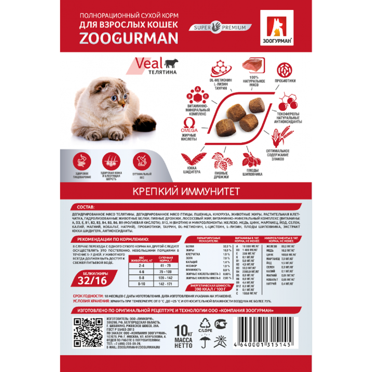 Корм сухой зоогурман крепкий иммунитет, для кошек, Телятина, полнорационный 1,5 кг