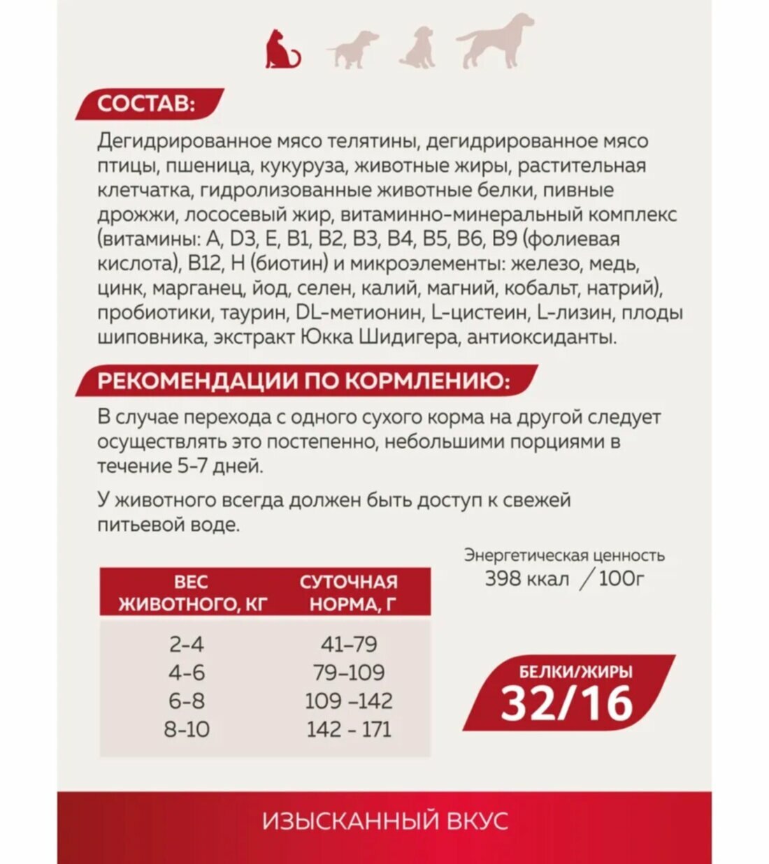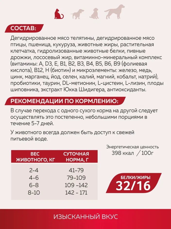 | Состав | дегидрированное мясо телятины, дегидрированное мясо птицы, пшеница, кукуруза, животные жиры,растительная клетчатка, гидролизованные животные белки, пивные дрожжи, лососевый жир, витаминно-минеральный комплекс (витамины: А, D3, Е, В1, В2, В3, В4, В5, В6, В9 (фолиевая кислота), В12, Н (биотин) и микроэлементы: железо, медь, цинк, марганец, йод, селен, калий, магний,кобальт, натрий), пробиотики, Таурин, DL-метионин, L-цистеин, L-лизин, плоды шиповника, экстракт Юкка Шидигера, антиоксиданты |