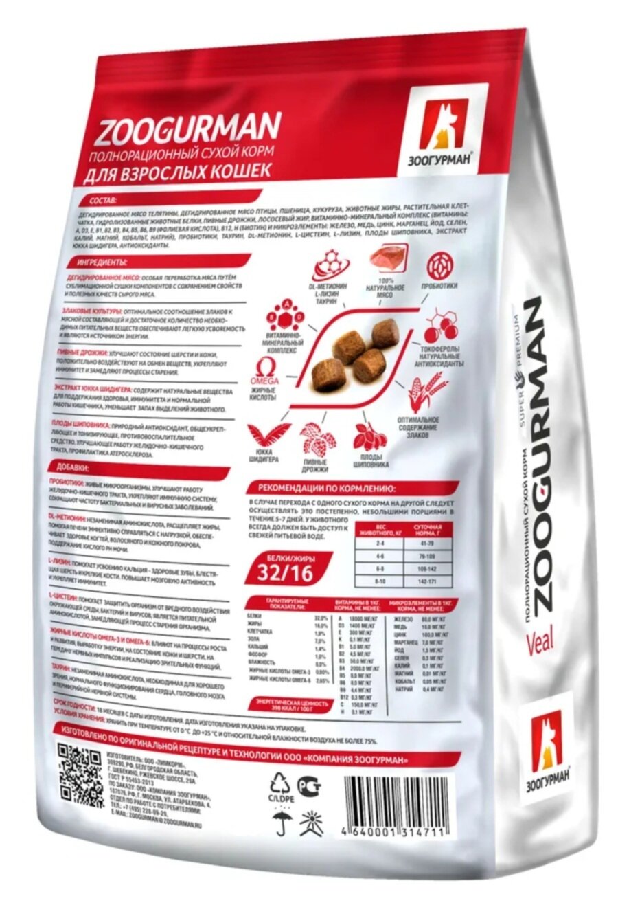Зоогурман Сухой корм для взрослых кошек с телятиной, 350г 0.35 кг