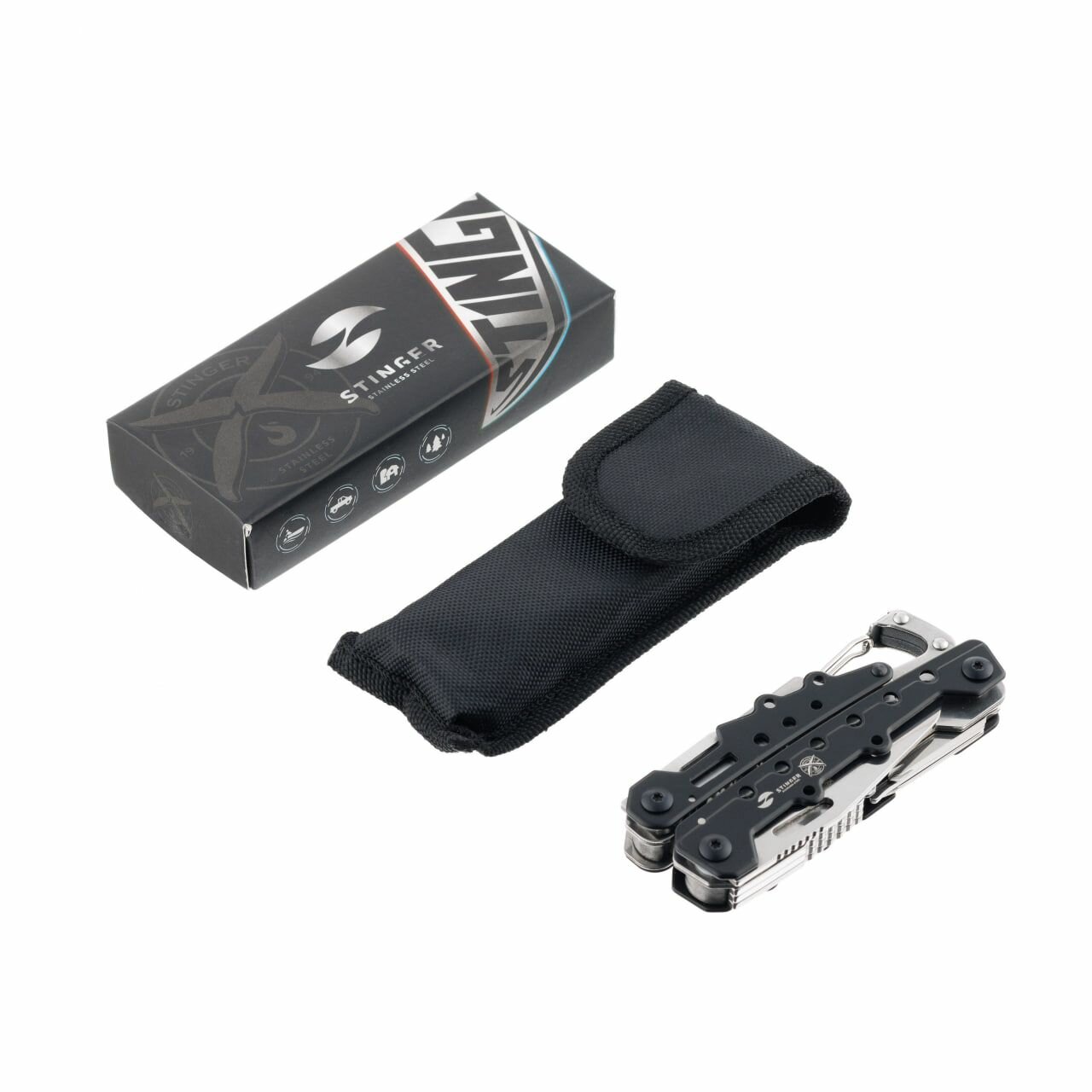 Мультитул Stinger, нержавеющая сталь, 12 функций, нейлоновый чехол, в картонной коробке, цвет черно-серебристый (MT-9160D)