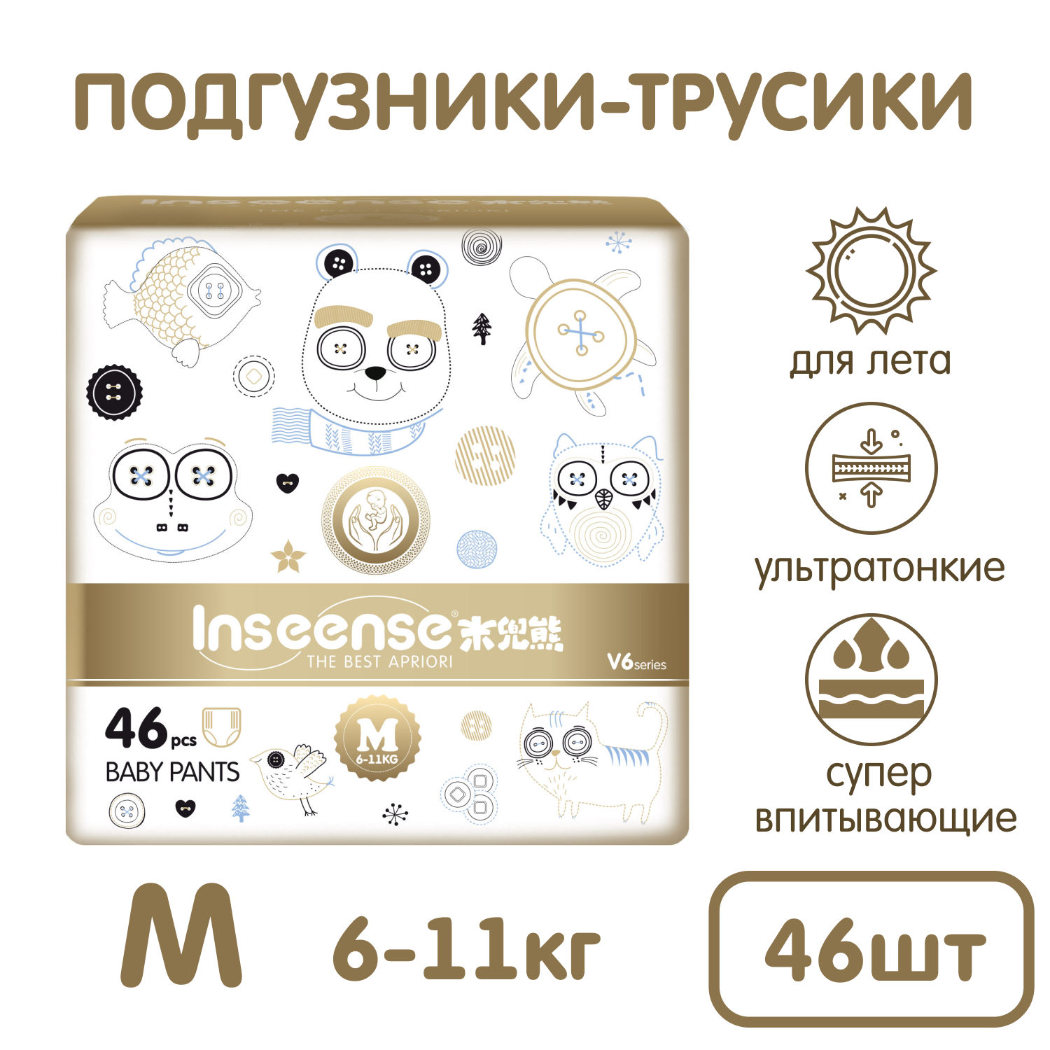 Подгузники-трусики супертонкие Inseense V6 M (6-11 кг.), 46 шт. (золотая упаковка)