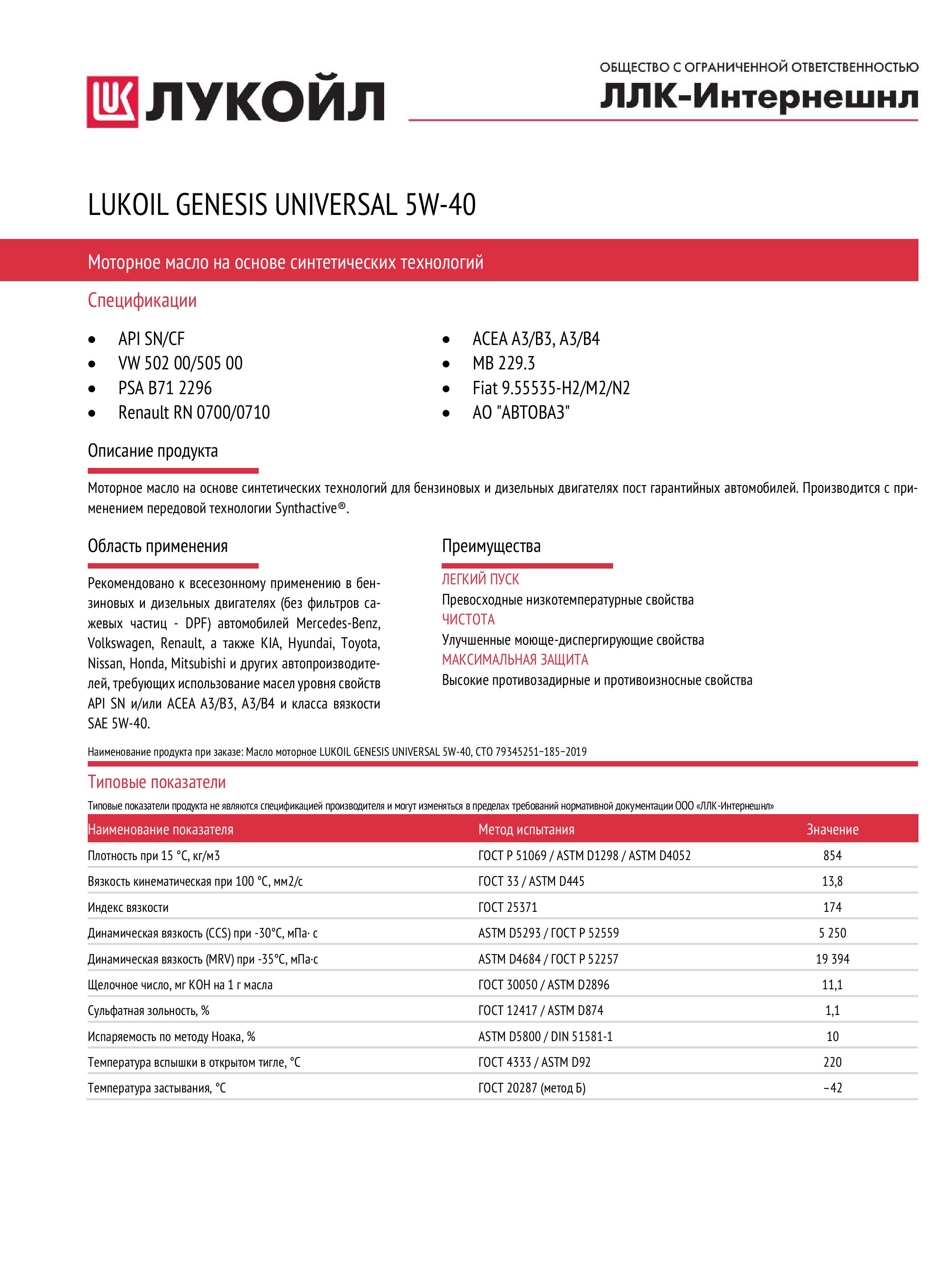 лукойл genesis universal 5w-40 п/с (1л) api sn acea a3/b4 api cf vw 502 00/505 00 mb 229.3 psa b71 2