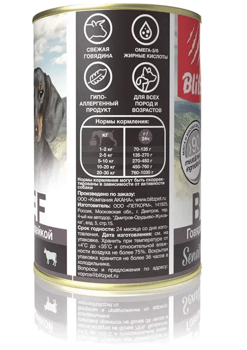 Консервы для собак Blitz / Блиц Sensitive для животных всех пород и возрастов, паштет из говядины с индейкой 400г / корм влажный