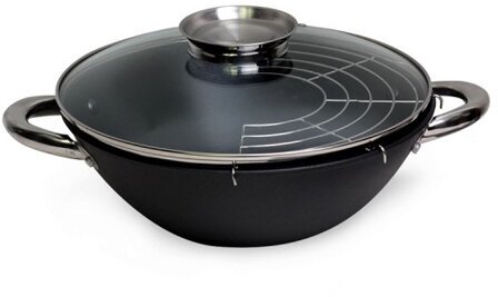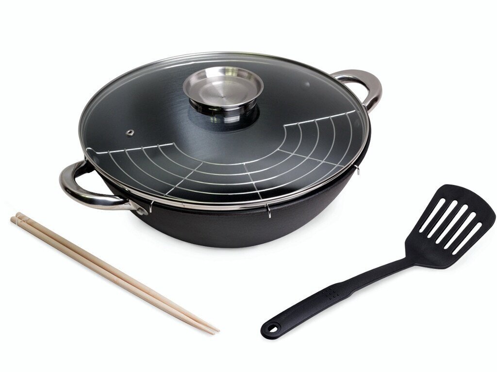 Казан чугунный "Wok", с антипригарным покрытием, с крышкой, с лопаткой, с сеткой и 2 палочками, 3,6 L