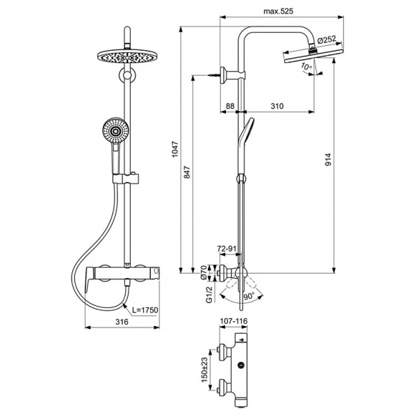 | Дополнительная информация | высота стойки для душа: 1047 мм; диаметр душевой лейки: 110 мм; диаметр верхнего душа: 250 мм |
