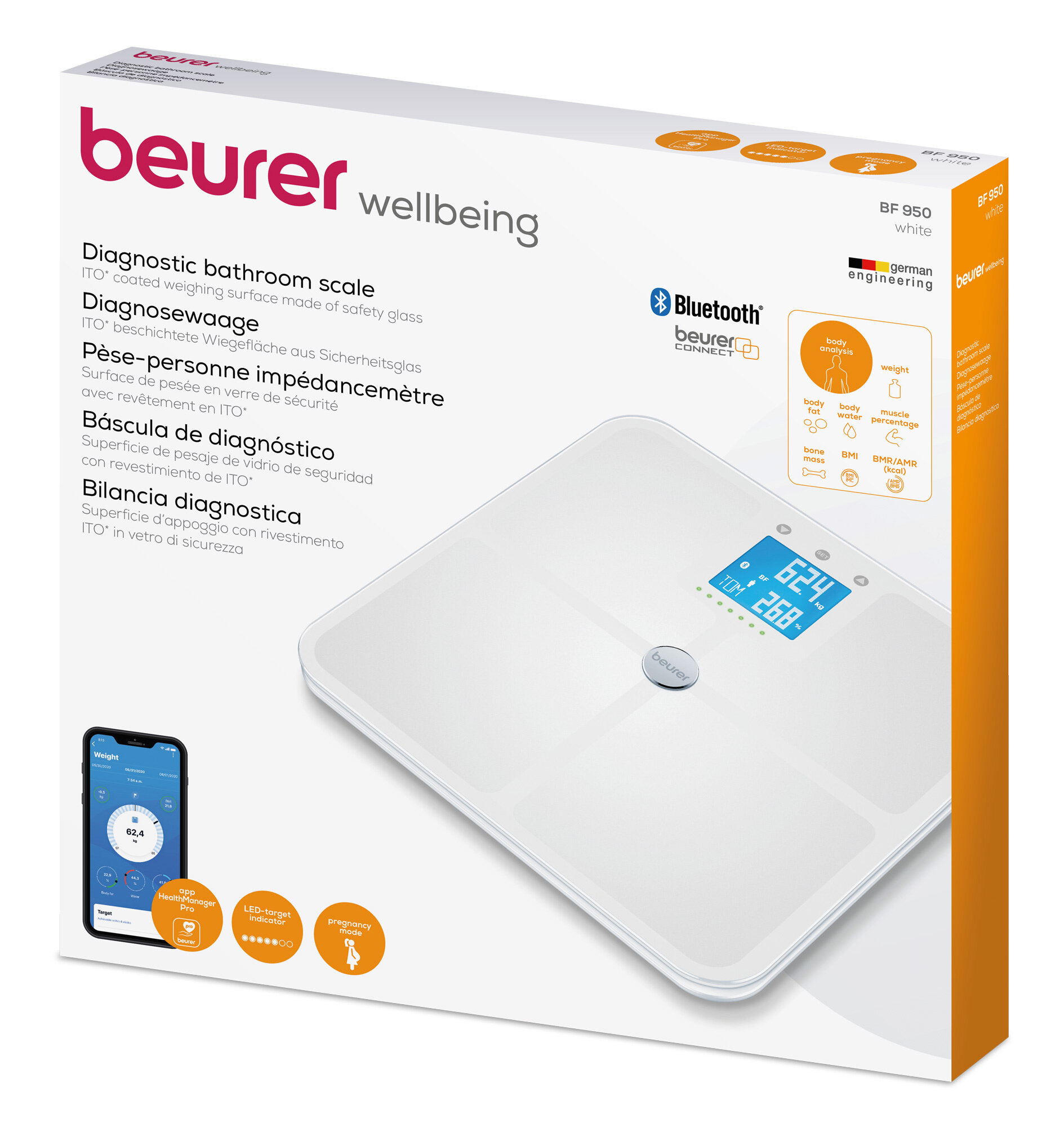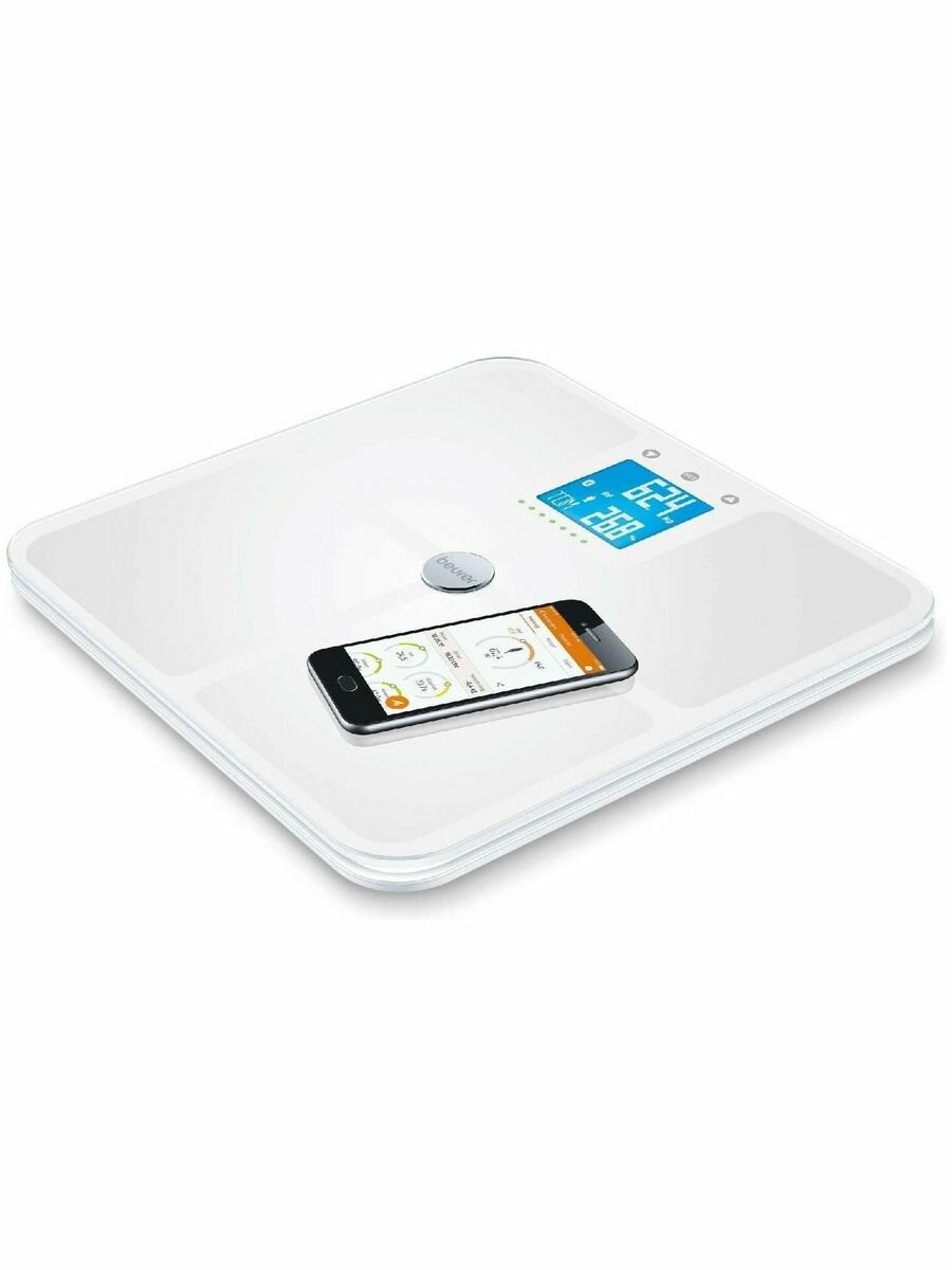 | Дополнительная информация | бесплатное приложение Beurer HealthManager; индикация калорий, скорости активного/основного обмена веществ и ИМТ; режим беременность; индикация заряда батареи; дисплей со светящимися символами |