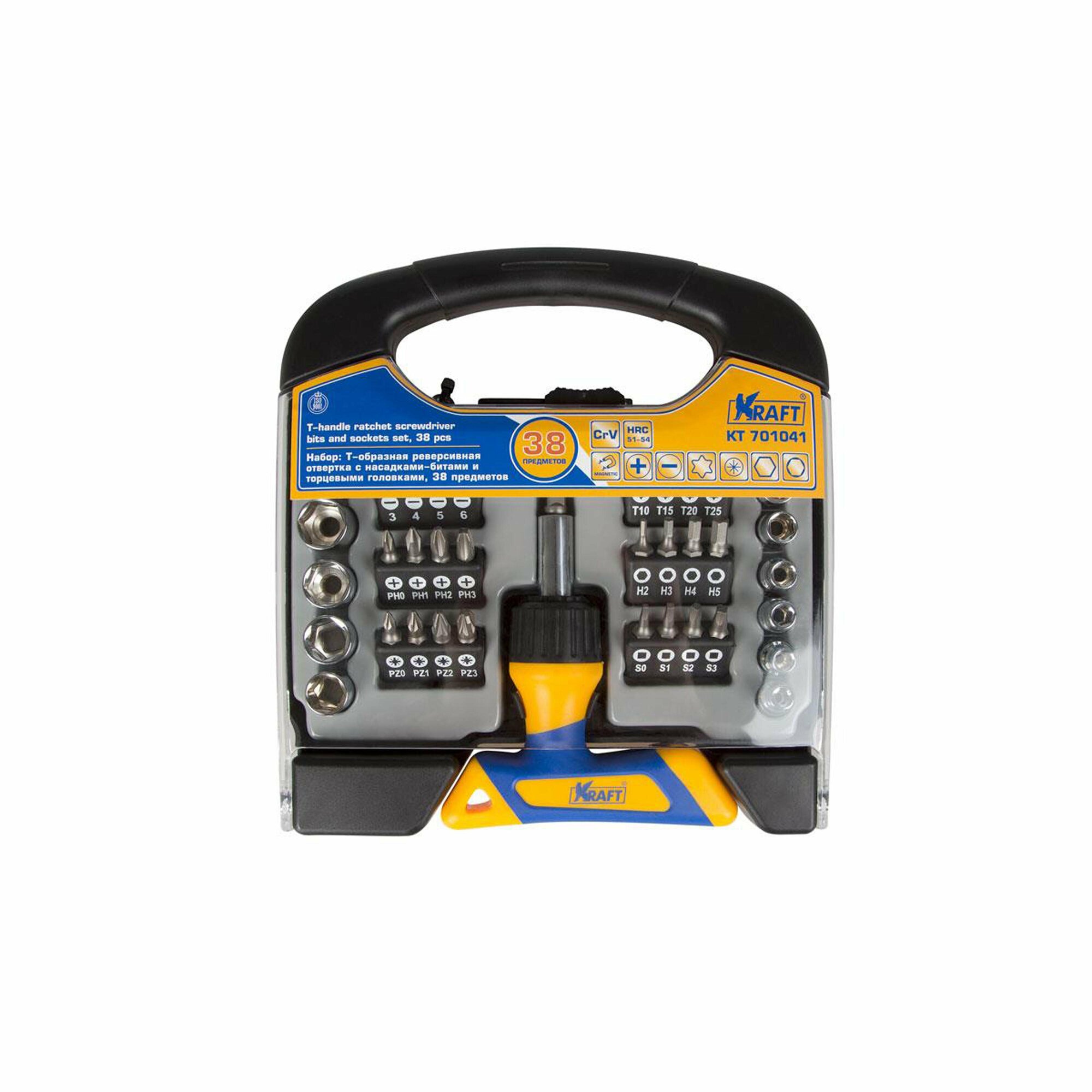 Т-образная реверсивная отвертка с битами и головками 38 предметов KRAFT KT 701041