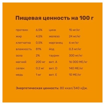 | Пищевая ценность | белок 6%, жир 4.5%, клетчатка 0.5%, зола 2%, влага 81% |