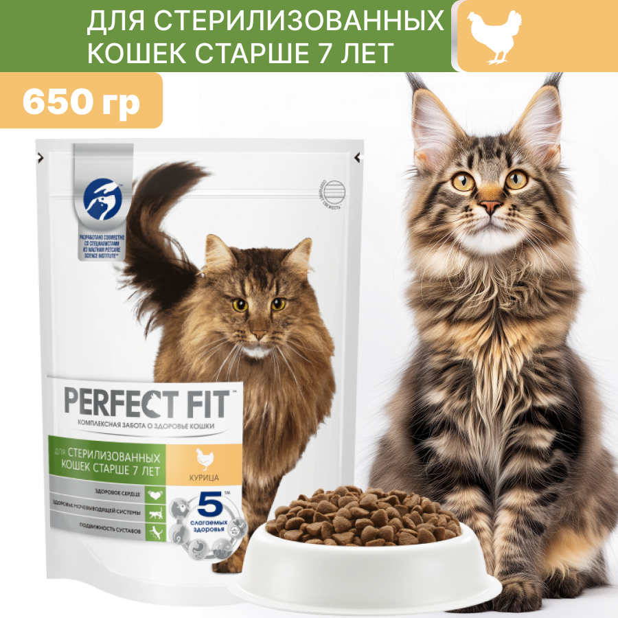 Корм сухой Perfec Fit 7+ для кошек старше 7 лет, с курицей 650 г