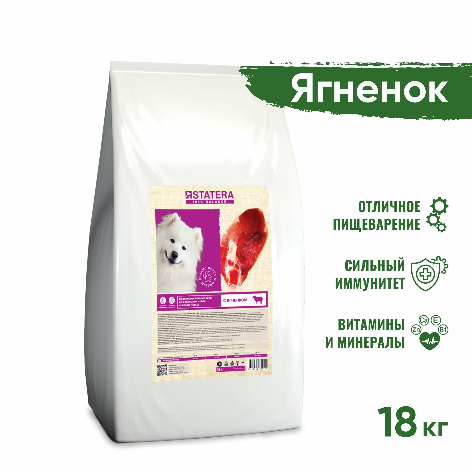 STATERA для взрослых собак средних пород с ягненком (18 кг)