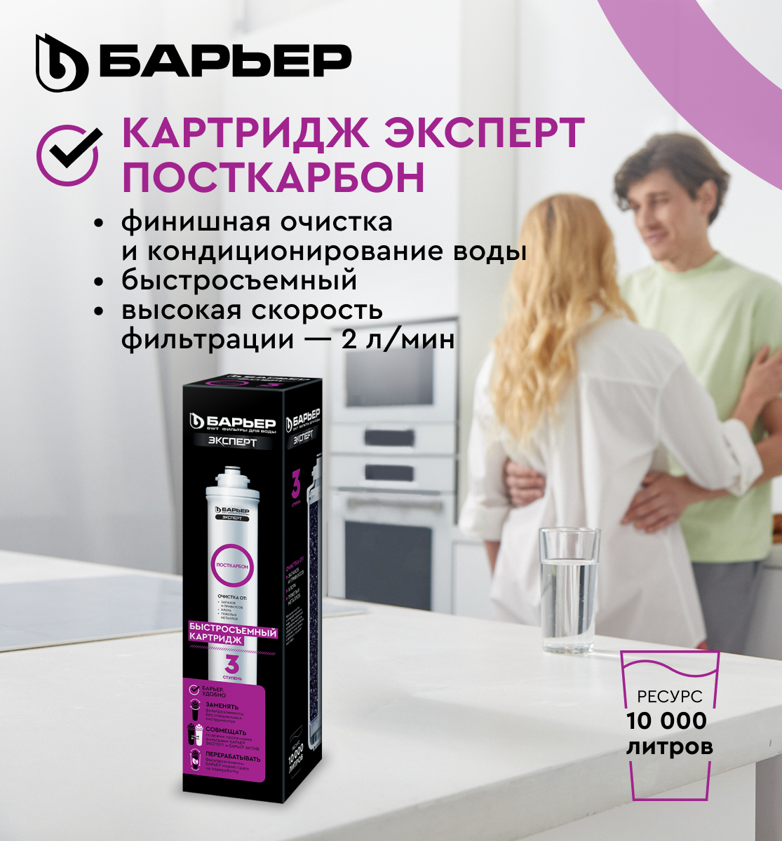 БАРЬЕР эксперт Посткарбон, картридж для фильтра под мойку, тонкая угольная фильтрация, быстросъемный