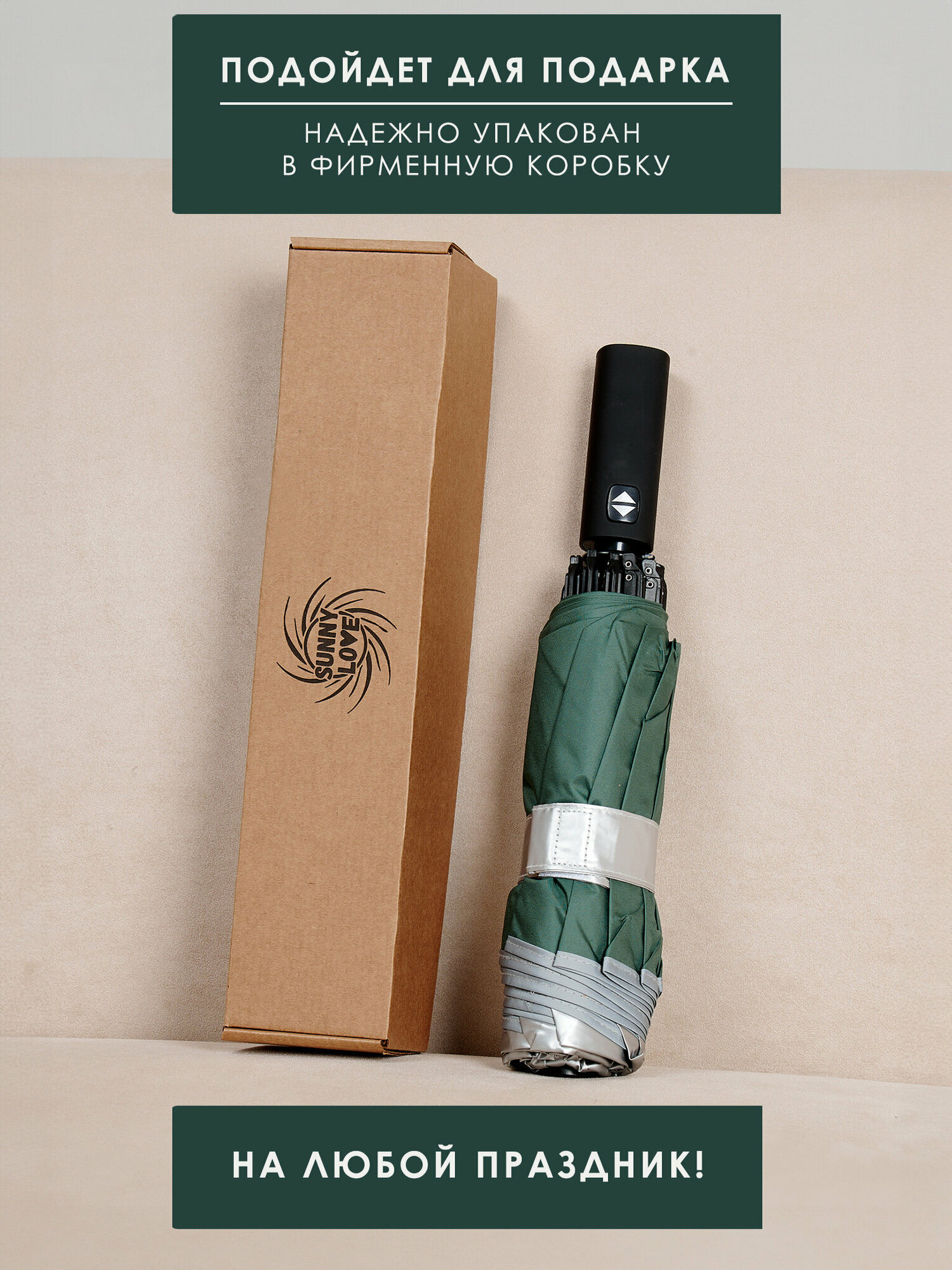 | Плюсы: | Большой плотный зонт. Автоматическое складывание. Светоотражающая полоса по кругу. Есть ремешок. |