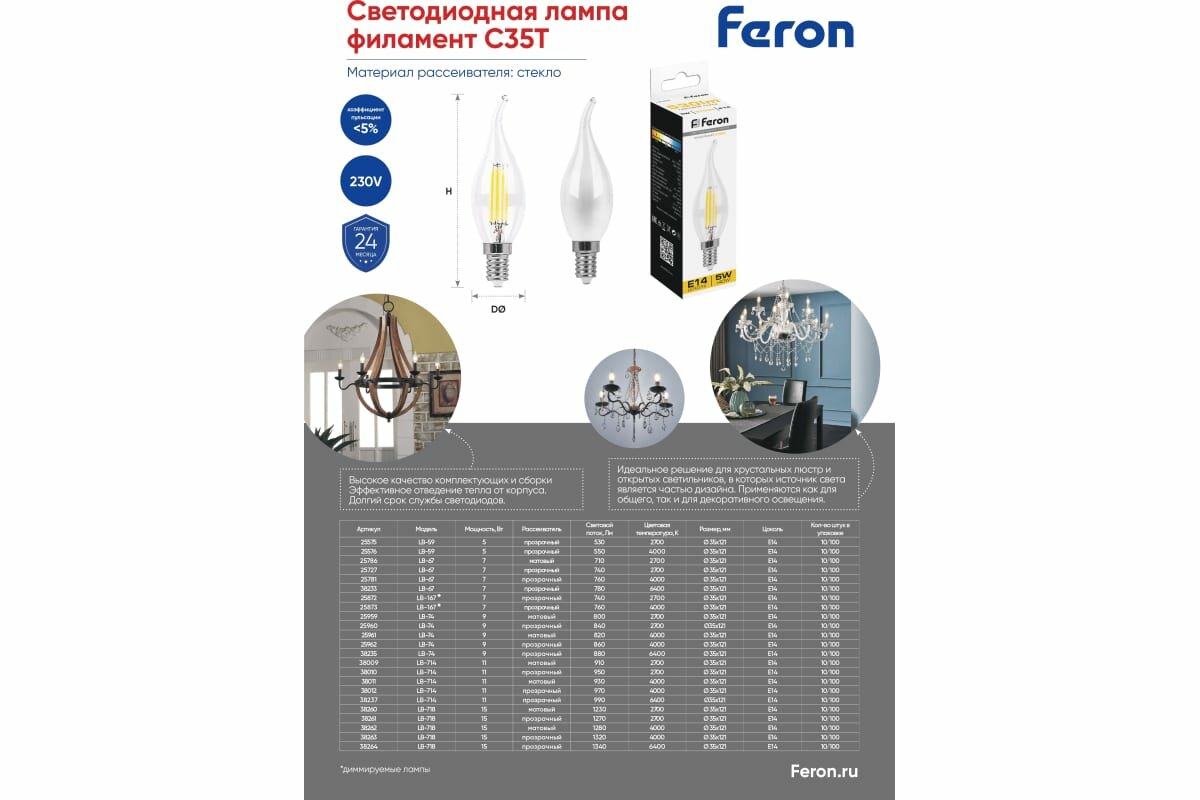 Лампа светодиодная диммируемая Feron LB-167 25873, E14, C35T, 7 Вт, 4000 К