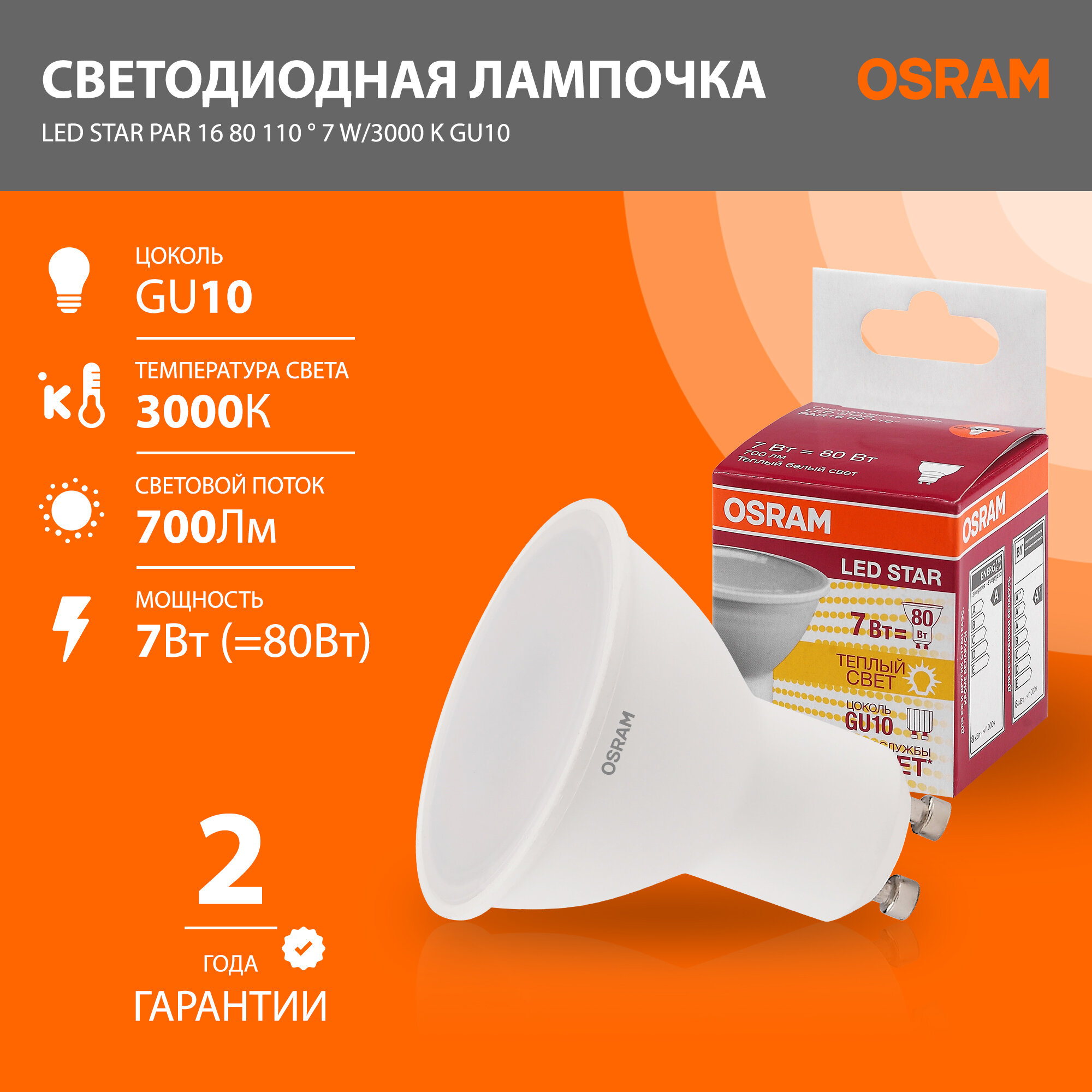 Светодиодная лампа Osram LED Star, Par16, 7Вт, GU10 700 Лм, 3000 К, теплый белый свет 4058075481497 .